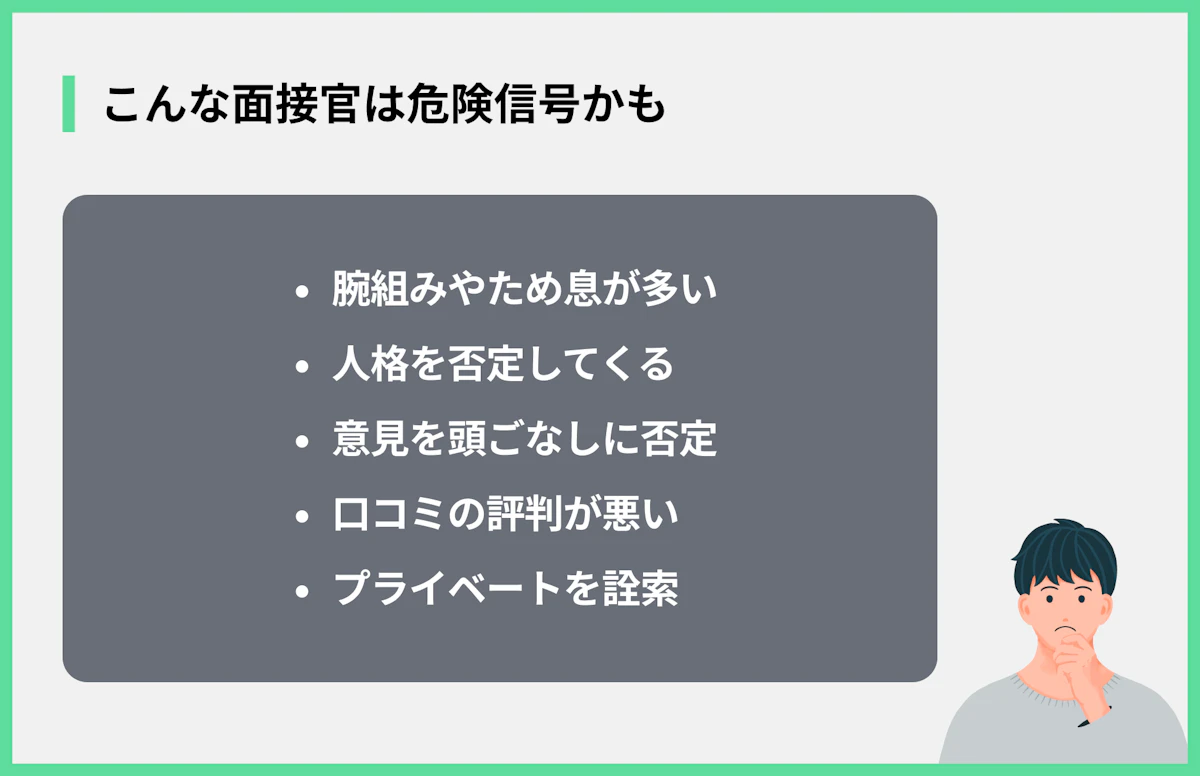 面接中、面接官の態度が高圧的な場合は注意が必要です。腕を組んだり、貧乏ゆすりをしたり、ため息をついたりといった態度は、相手への敬意が欠けている証拠です。