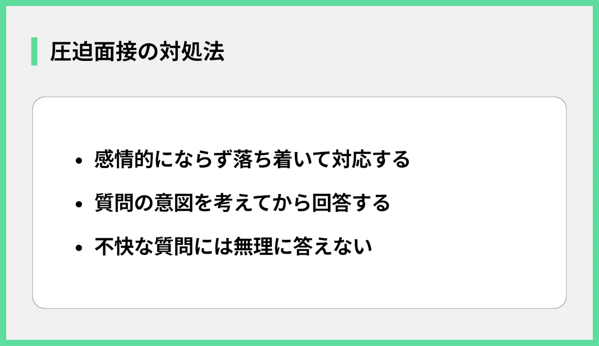実際に圧迫面接に遭遇してしまったら、どうすれば良いのでしょうか。圧迫面接を乗り切るための具体的な対処法は以下の通りです。