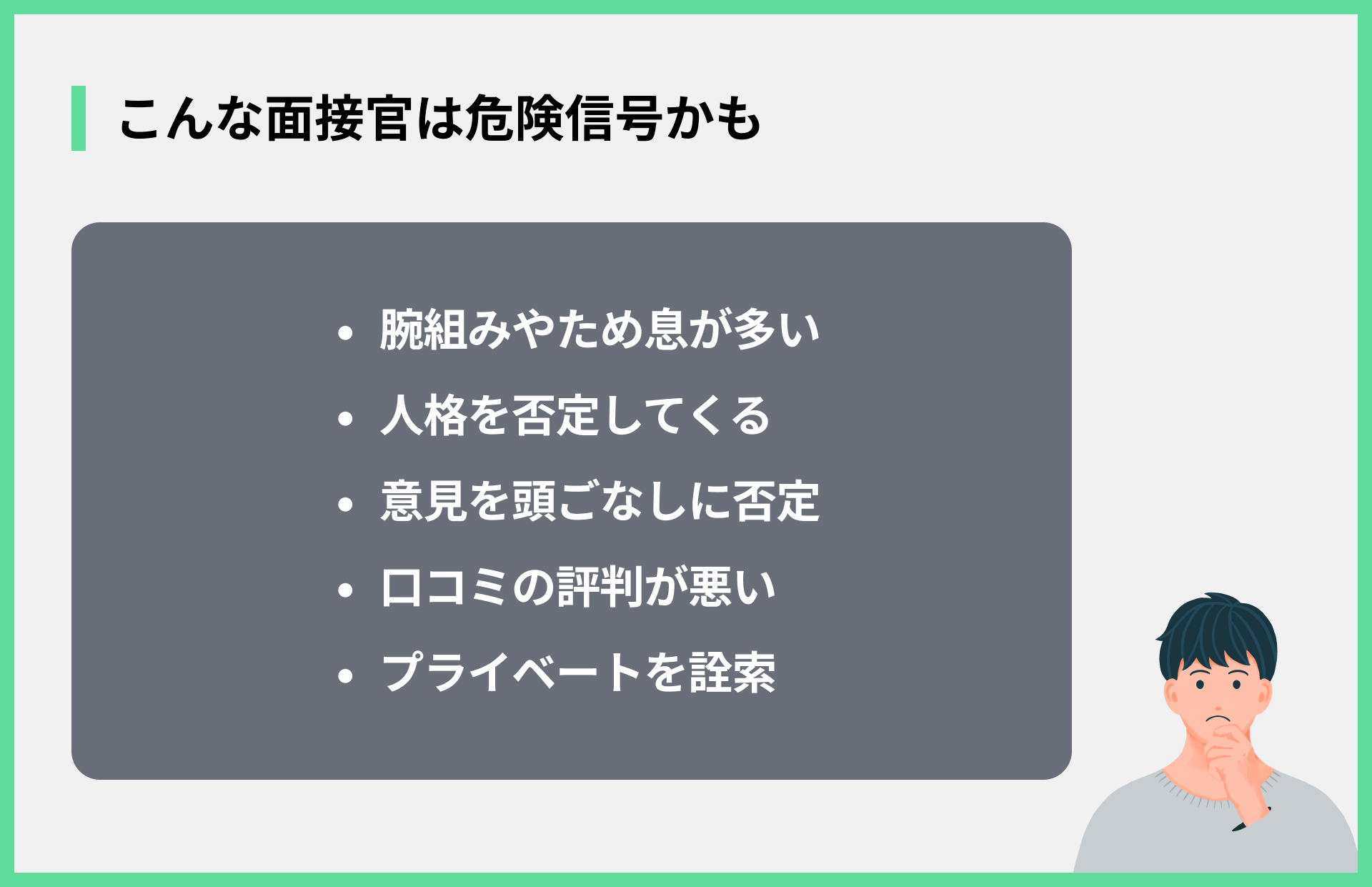 スキルや経験について厳しく問われるならまだしも、スキルや経験ではなく人格を否定されたら危険信号です。「君みたいな人はうちには合わない」「本当にやる気あるの?」といった発言は、健全な面接の範囲を逸脱しています。
