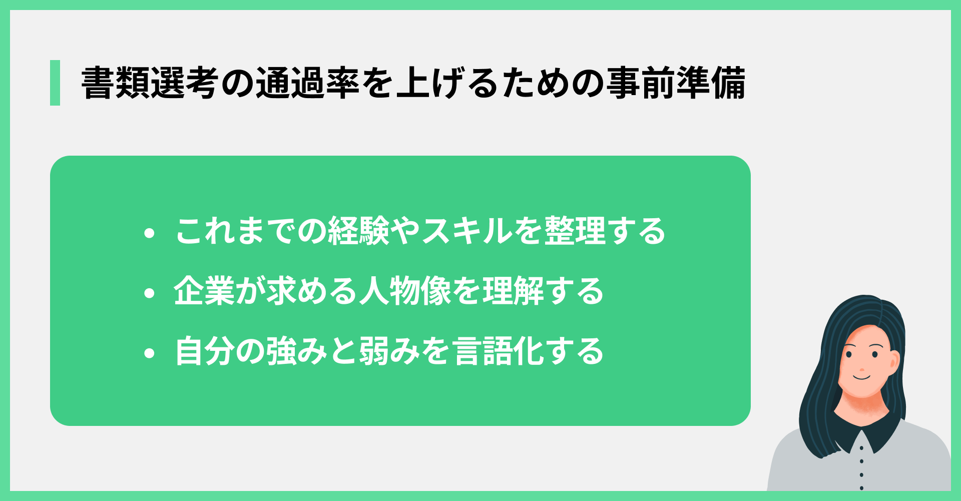 書類選考の通過率を上げるためには、いきなり書類を書き始めるのではなく、事前の準備が重要です。具体的には以下の項目について解説します。
