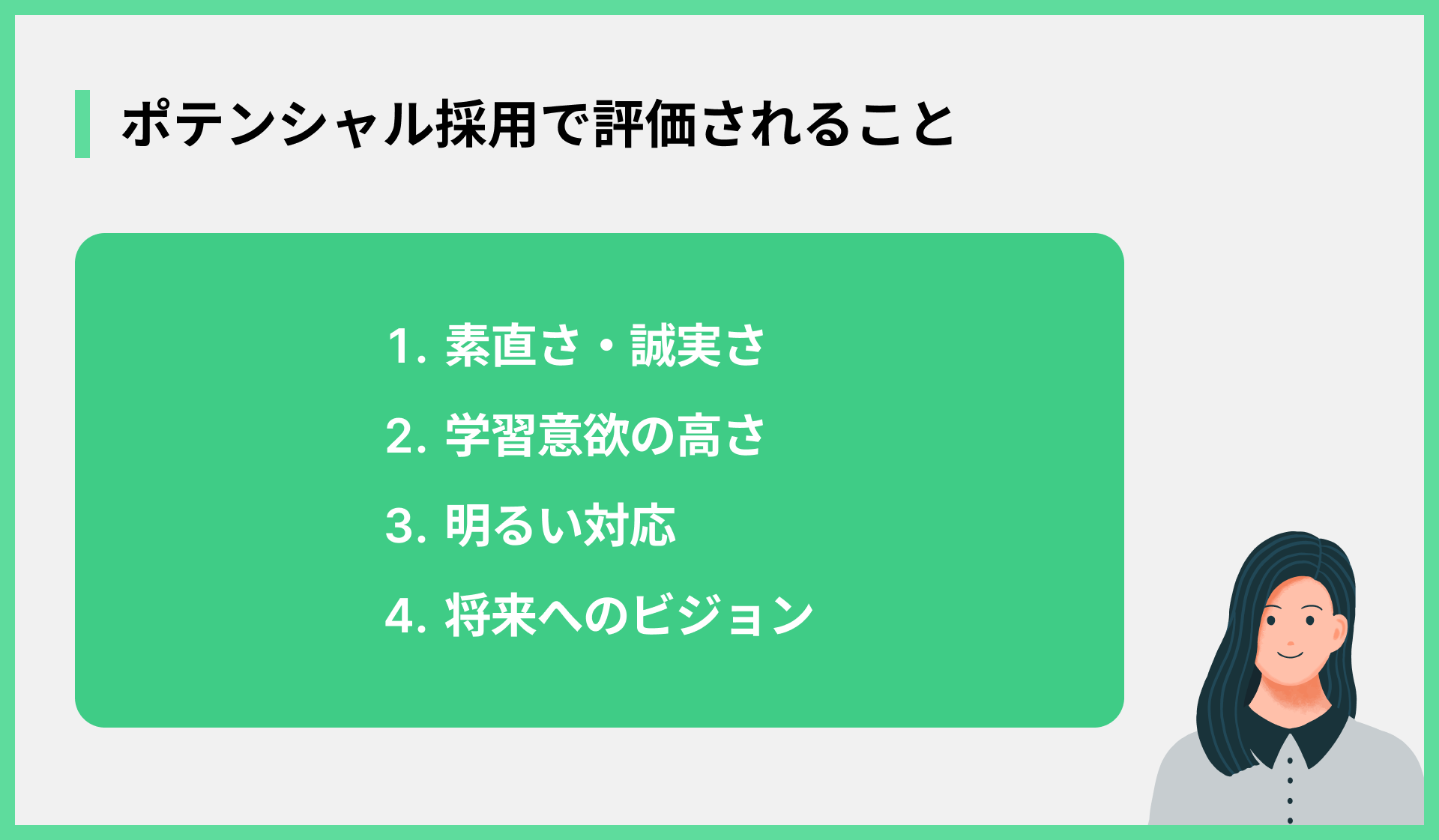 ポテンシャル採用とは、現時点でのスキルや経験ではなく、その人の将来性や伸びしろに期待して採用する方法です。これはまさに、若さが最大の武器になる採用枠です。仕事への熱意や学習意欲をアピールすることで、経験者よりも高い評価を得られる可能性があります。