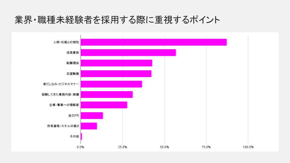 参照:「業界・職種未経験者の採用で重視するポイントは、「人柄・社風との相性」が最多。評価する能力トップは「コミュニケーション能力」/株式会社学情のプレスリリース」