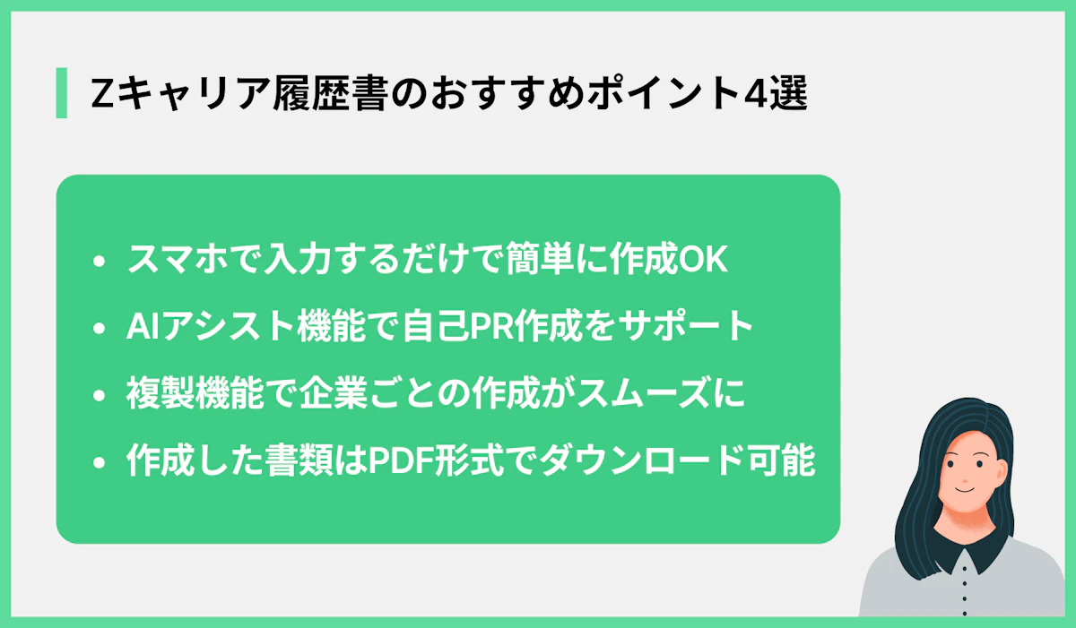 ここまで、高品質な履歴書や職務経歴書を作成するための数多くのポイントを解説してきましたが、これらすべてをゼロから実践するのは大変な労力がかかります。そこでおすすめしたいのが、転職活動を効率化するために設計されたツールを活用することです。特に「Zキャリア履歴書」は、忙しいあなたの転職活動を強力にサポートする機能が満載です。見栄えの良いフォーマットに沿って入力するだけで、ビジネスマナーに則った読みやすい書類が簡単に完成します。自己PRや志望動機の作成をサポートするAI機能や、応募企業ごとの書類管理機能など、かゆいところに手が届くサービスが揃っており、書類作成にかかる時間とストレスを大幅に削減できるでしょう。