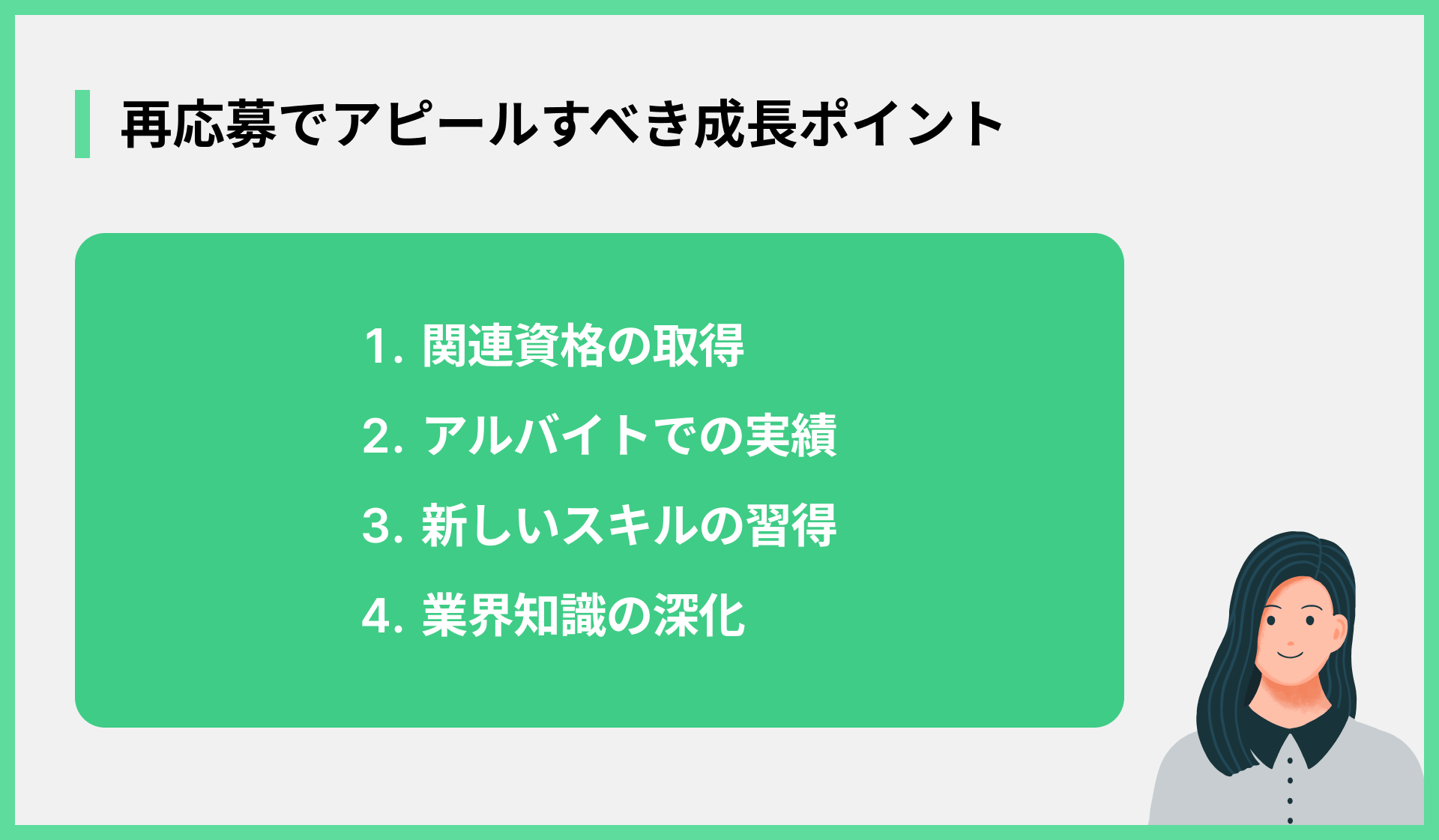 再応募で最も大切なのは、前回の応募時からの成長を具体的に示すことです。「前回落ちてから、これだけ成長しました」という点を明確にアピールできなければ、採用には繋がりません。例えば、「応募職種に関連する資格を取得した」「アルバイトで新しい役職に就き、マネジメント経験を積んだ」など、具体的な成長を示す必要があります。前回の反省を活かし、パワーアップした自分をアピールしましょう。