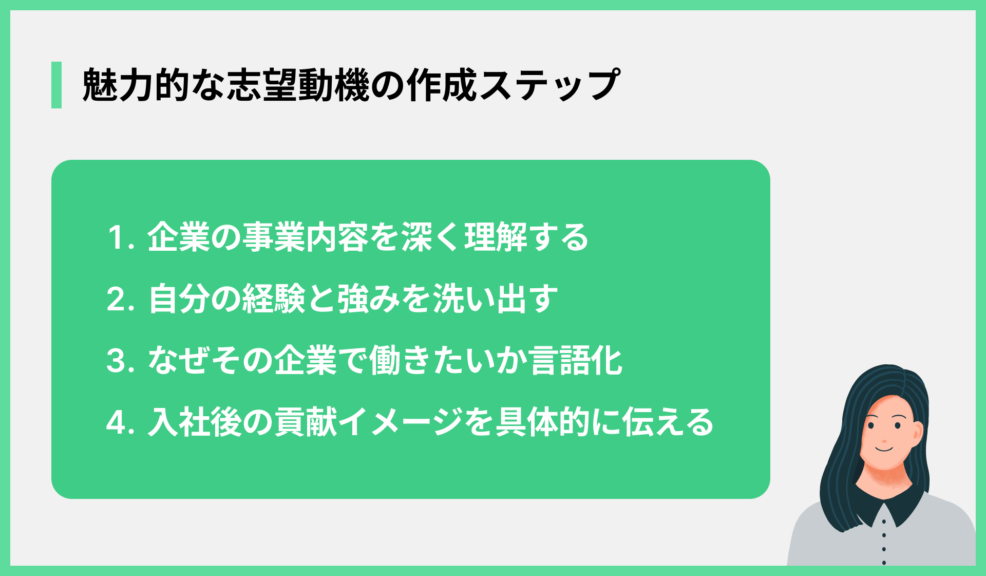 その企業だけの特別な志望動機になっていないと、熱意は伝わりません。「貴社の将来性に惹かれました」といった、どの企業にも言えるような志望動機では、採用担当者の心には響きにくいものです。「なぜ他の会社ではなく、この会社で働きたいのか」を、自分の言葉で具体的に説明することが重要です。企業のどんな点に魅力を感じ、自分のどんな経験を活かして貢献したいのかを、しっかりと伝えましょう。