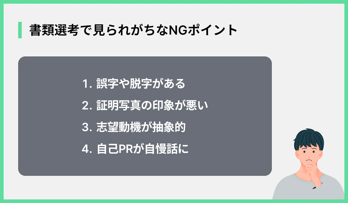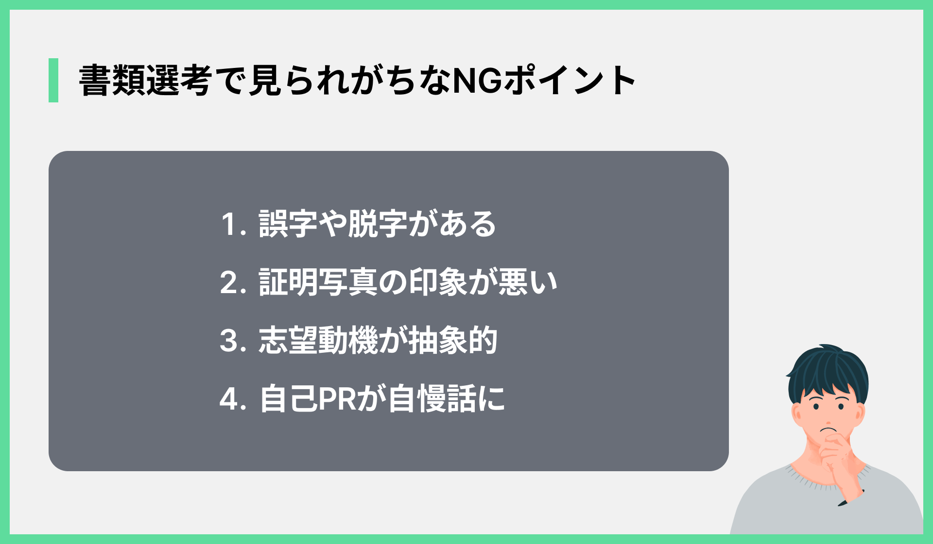 気持ちが少し落ち着いたら、なぜ書類選考で落ちてしまったのか、客観的に原因を考えてみましょう。主な原因としては、以下の点が考えられます。