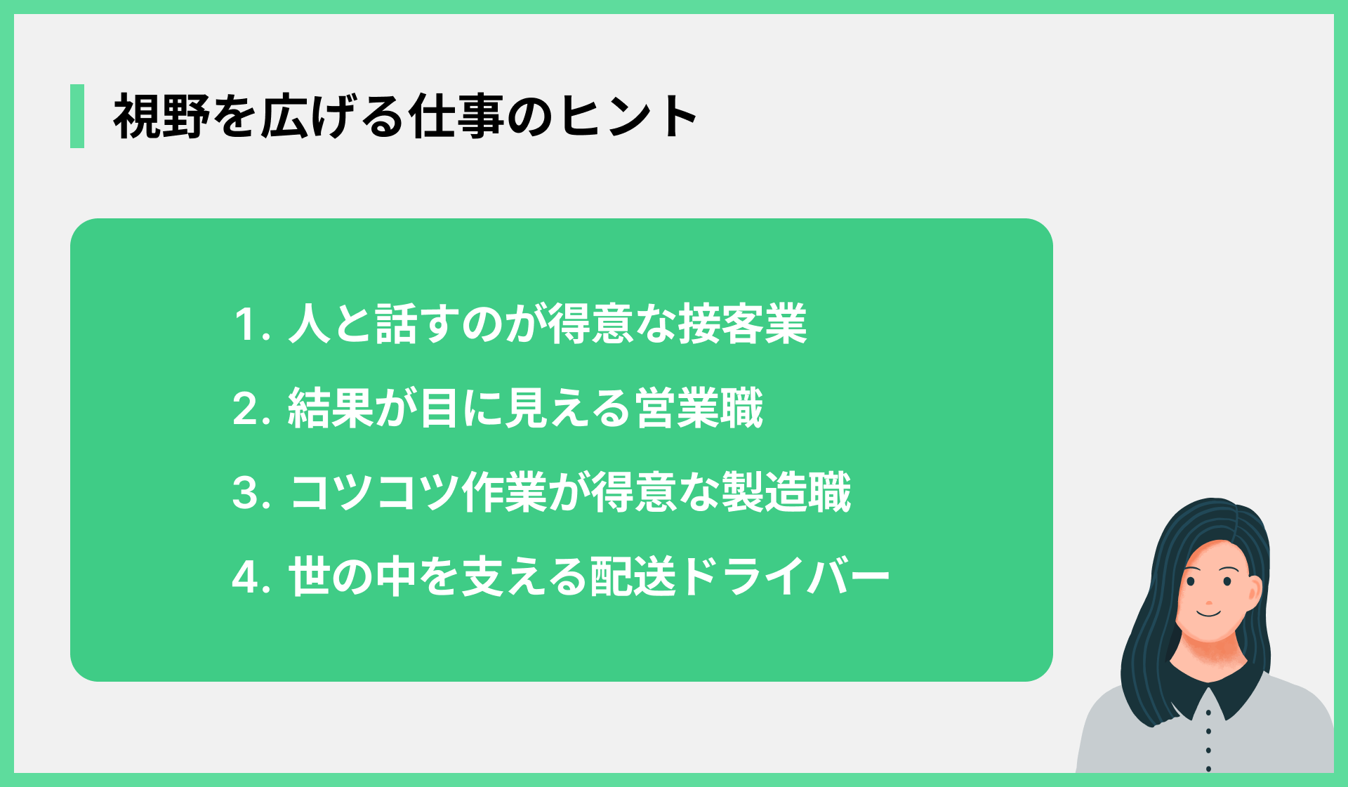 応募企業の視野を広げると、新たな可能性が見つかることがあります。もしかしたら、強みや経験は、今まで見ていなかった業界や職種でこそ輝くかもしれません。同じ職種でも業界が違えば求められることは変わります。少し視野を広げて、これまで候補に入れていなかった企業の情報も見てみることをおすすめします。
