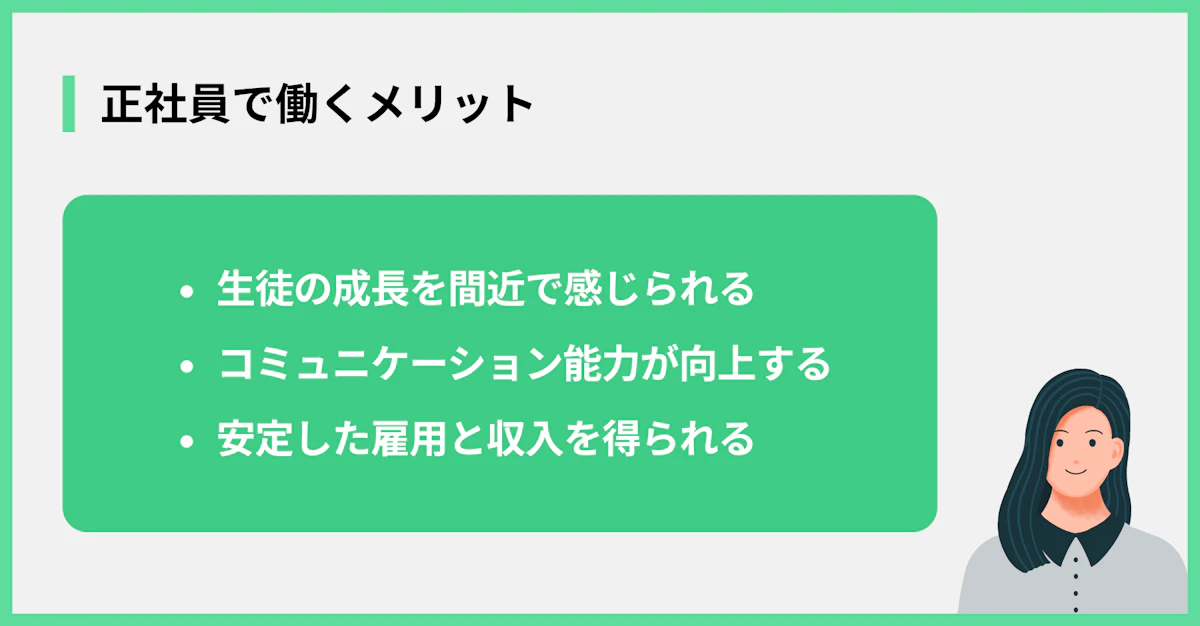 塾講師として正社員で働くことには、たくさんの魅力があります。主なメリットは以下の通りです。