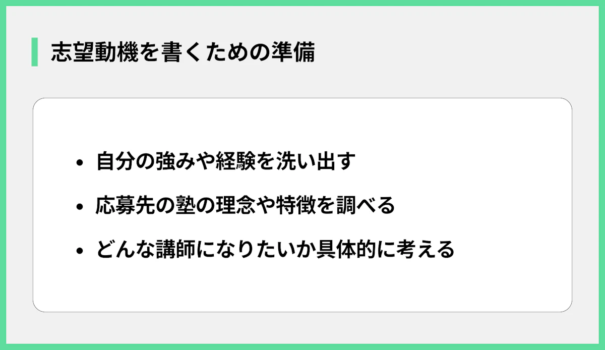 正社員として塾講師を目指すなら、志望動機で伝えるべき重要なポイントがあります。具体的には以下の内容を盛り込むことが大切です。