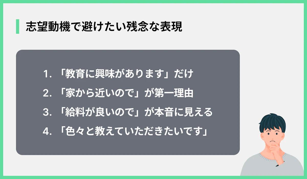 - 志望動機で避けるべきNGな特徴 {{/list_box_green}}