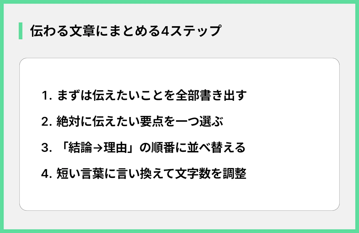 すべての情報を無理に詰め込もうとすると、かえって読みにくくなり、何が言いたいのか伝わらなくなってしまいます。まずは書きたいことをすべて紙に書き出し、そこから「これだけは絶対に伝えたい!」というポイントを厳選する作業から始めてみましょう。