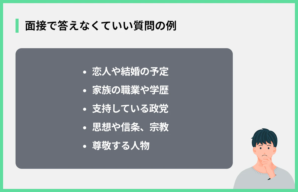あまりにしつこい場合は、「プライベートなことですので、お答えは控えさせていただきます」と、丁寧にはっきりと断る勇気も必要です。答えに詰まっても、評価が下がるわけではないので安心してください。