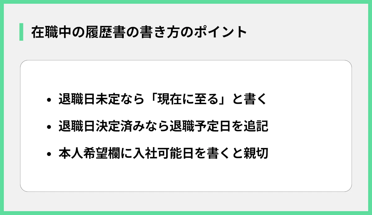 すでに退職日が確定している場合は、その日付を明記することで、採用担当者に入社可能時期の目安を伝えることができます。書き方としては、現在所属している会社の職歴を記入した一行下に「現在に至る」と記載し、その後ろに()書きで「(yyyy年mm月dd日 退職予定)」と加えます。こうすることで、現在も在籍中である事実と、いつから就業可能になるのかを同時に示すことが可能です。採用担当者は、自社の採用計画と照らし合わせて選考を進めやすくなるため、よりスムーズなコミュニケーションが期待できます。退職日が確定している場合は、この形式で正確に情報を伝えることが、丁寧で親切な印象を与えることにも繋がります。
