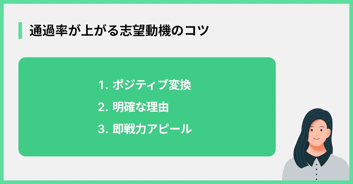 在職中の転職活動において、志望動機で現職の不満やネガティブな退職理由を述べるのは避けるべきです。例えば、「給与が低い」「人間関係が悪い」といった理由は、採用担当者に「同じ理由でまた辞めるかもしれない」という懸念を抱かせる可能性があります。そうではなく、「〇〇というスキルを、より専門的に高めたい」「現職では経験できない△△の分野に挑戦し、キャリアの幅を広げたい」といった、ポジティブな「挑戦したい理由」に変換することが重要です。これにより、向上心や成長意欲をアピールでき、採用担当者に「自社で活躍してくれそうだ」という前向きな印象を与えることができます。過去(現職)への不満ではなく、未来(貴社)への希望を語ることが、通過率を上げるための鍵となります。