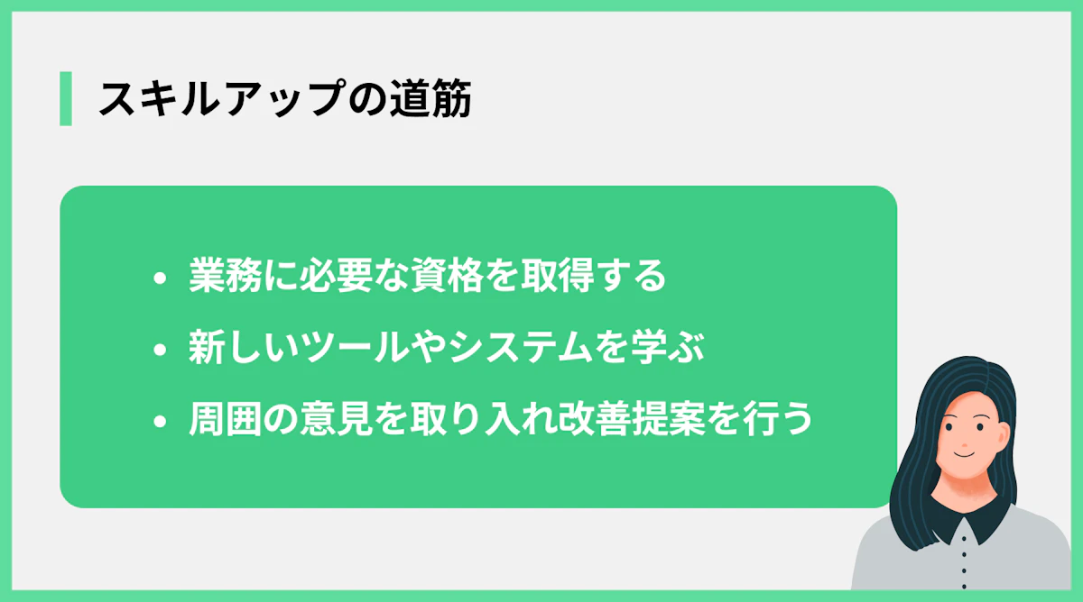 バックオフィス業務でキャリアを築いていくためには、継続的なスキルアップが不可欠です。ここでは、バックオフィス業務で役立つスキルを身につけるための具体的な方法を紹介します。