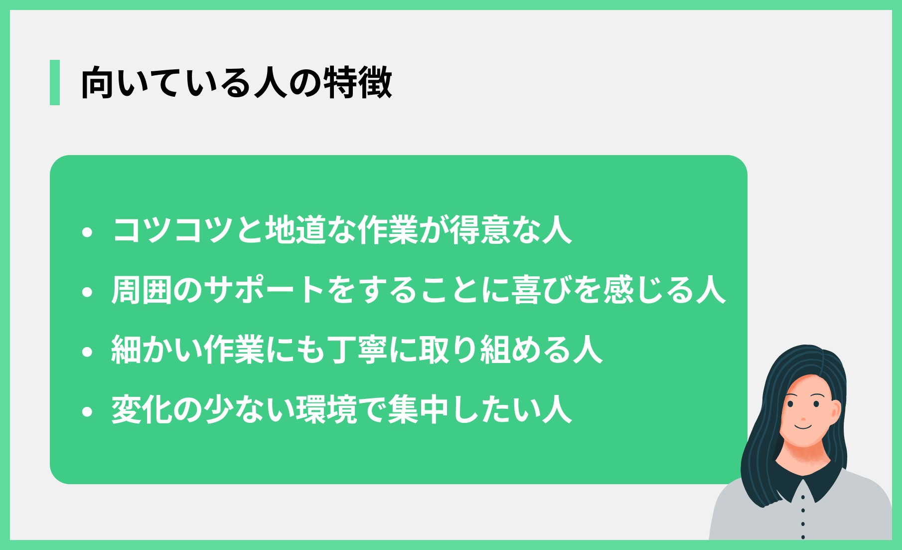バックオフィス業務は、特定のスキルや性格を持つ人にとって、非常に働きやすい環境です。ここでは、バックオフィス業務が向いている人の特徴を具体的に紹介します。自分に当てはまるかどうか、確認してみましょう。