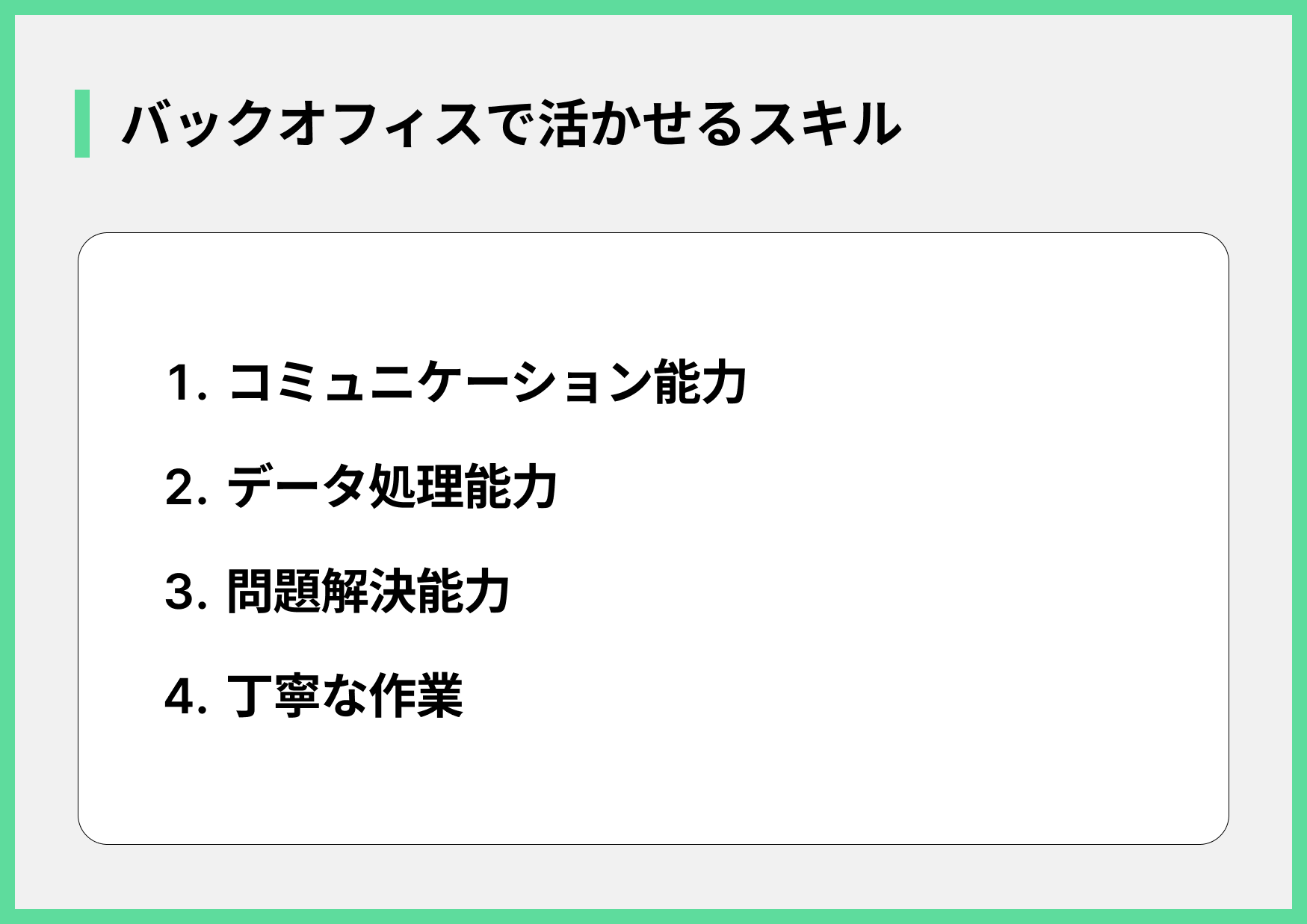 未経験からバックオフィス業務を目指す場合でも、これまでの経験が全く無駄になることはありません。例えば、接客業で培ったコミュニケーション能力は、人事や総務の業務で活かせるでしょう。また、販売職で数字を扱った経験があれば、経理業務への適性があるかもしれません。自身のこれまでの経験を振り返り、どのようなスキルや強みがあるのかを洗い出すことが大切です。その上で、その強みが活かせるバックオフィス業務を選ぶと、よりスムーズに転職活動を進めることができます。