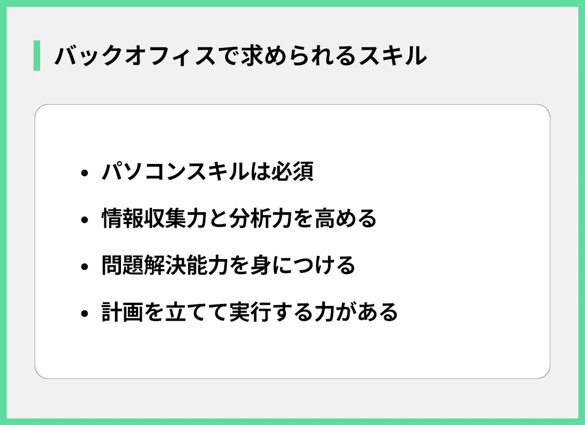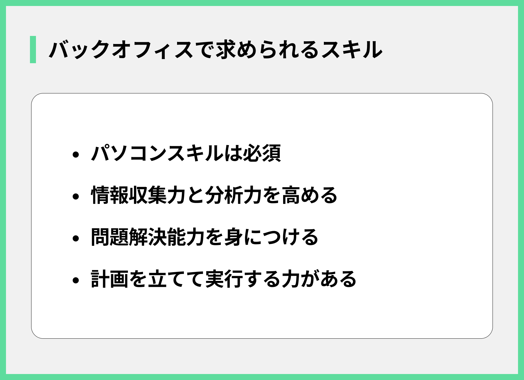 バックオフィス業務で活躍するためには、特定のスキルと能力が求められます。これらのスキルを身につけることで、未経験からでもバックオフィスへの転職を成功させ、業務に貢献できる可能性が高まります。バックオフィス業務で求められるスキルと能力は以下の通りです。