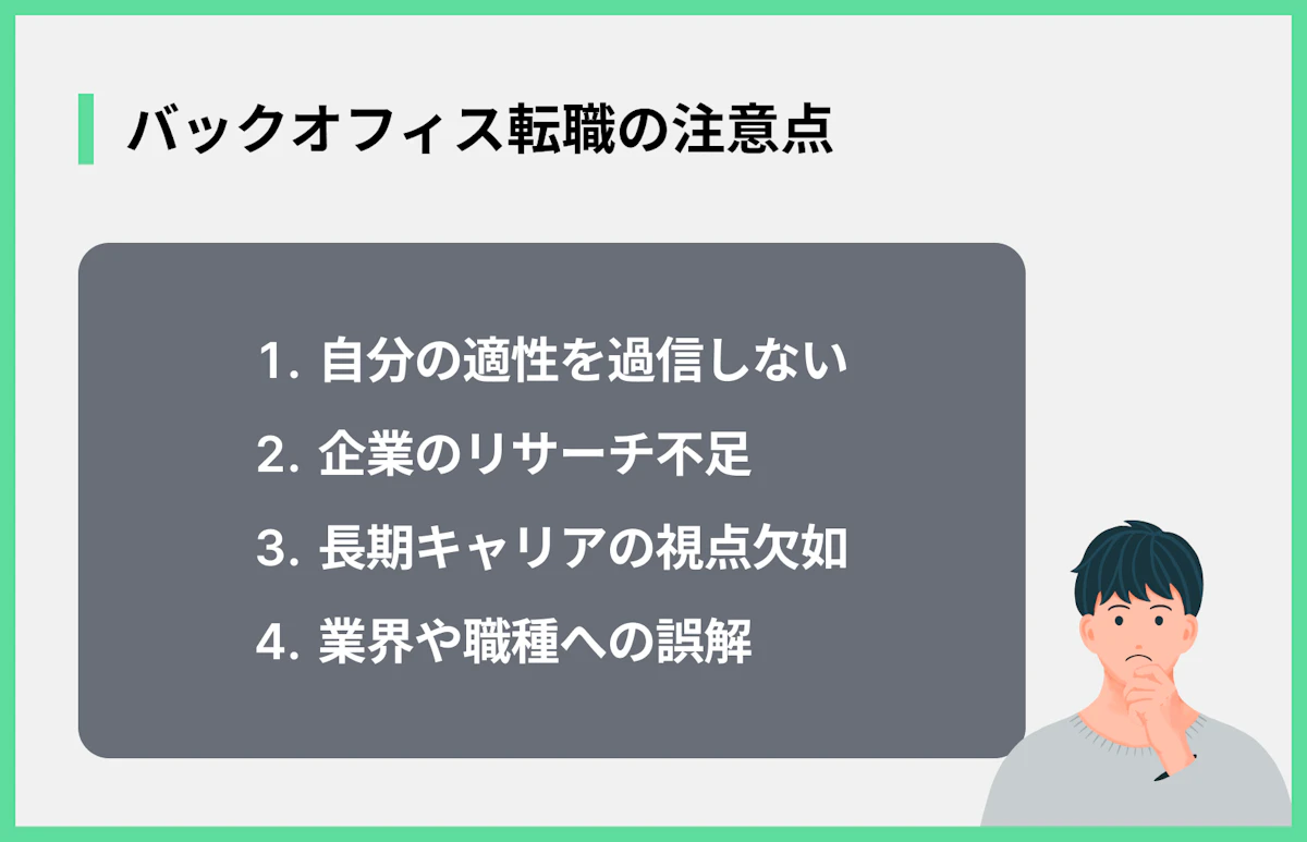 バックオフィスへの転職を検討する際、後悔しないためには事前にしっかりとした準備と情報収集が必要です。ここでは、転職後にミスマッチが起きないようにするためのポイントを解説します。バックオフィスへの転職で後悔しないために理解すべきは以下の通りです。