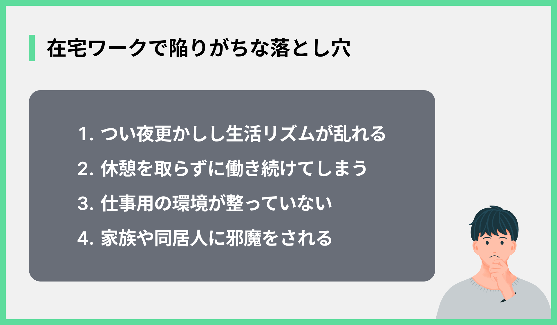 生活空間と仕事場が同じになるため、自己管理が重要になります。仕事のオンとオフの境界が曖昧になり、だらだらと夜遅くまで仕事をしてしまう可能性があります。「朝起きたらパジャマから着替える」「仕事を開始する時間と終了する時間を決める」など、自分なりのルールを作ることが、メリハリをつけて働くためのコツです。