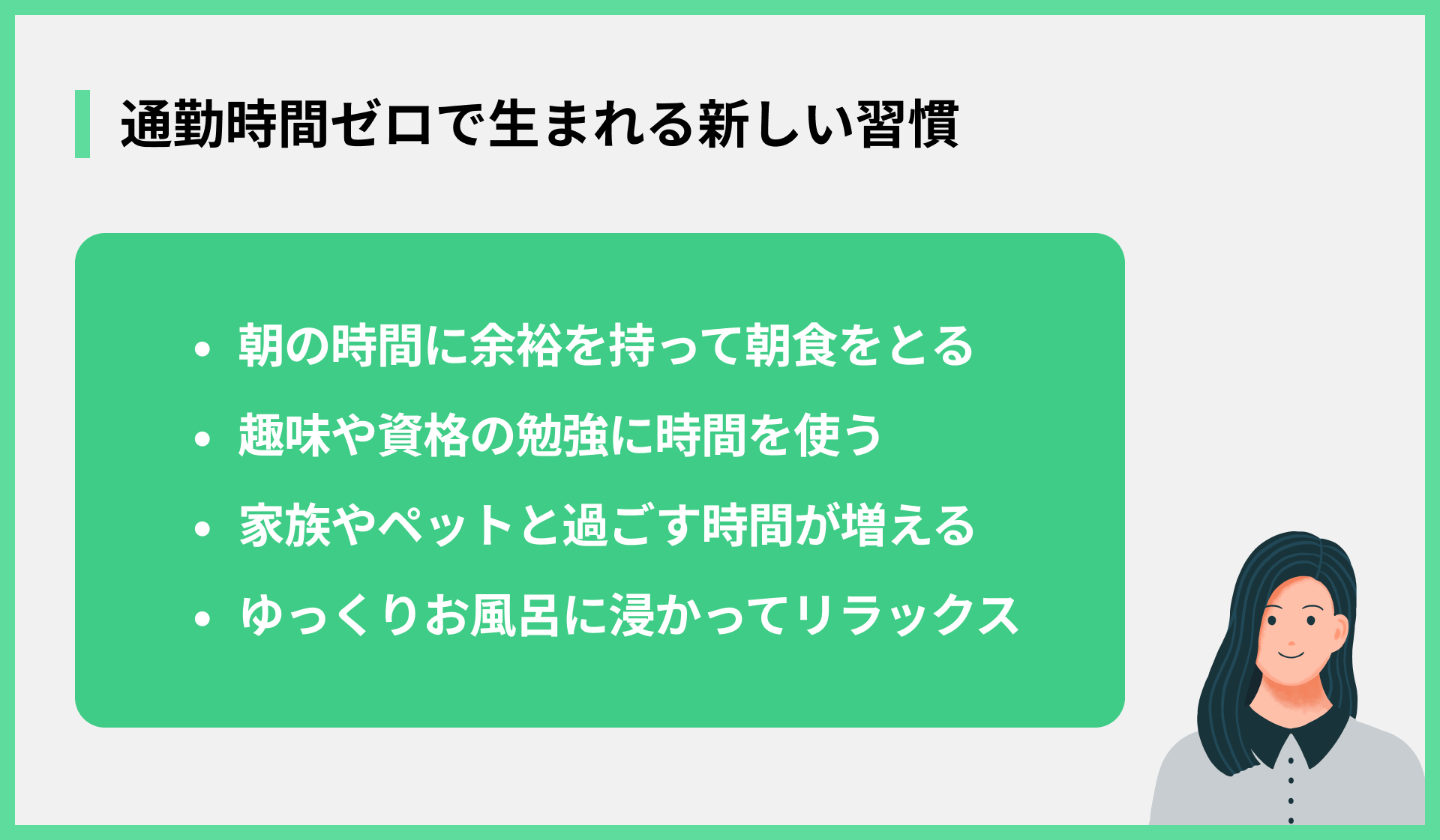 通勤時間がなくなることで、時間を有効活用できるようになります。毎日の満員電車や交通渋滞から解放されるのは、体力的にも精神的にも楽になります。往復で1〜2時間かかっていた通勤時間がゼロになれば、その時間を趣味や勉強、睡眠などに充てることができます。プライベートな時間が増えることで、生活全体の満足度が向上するでしょう。