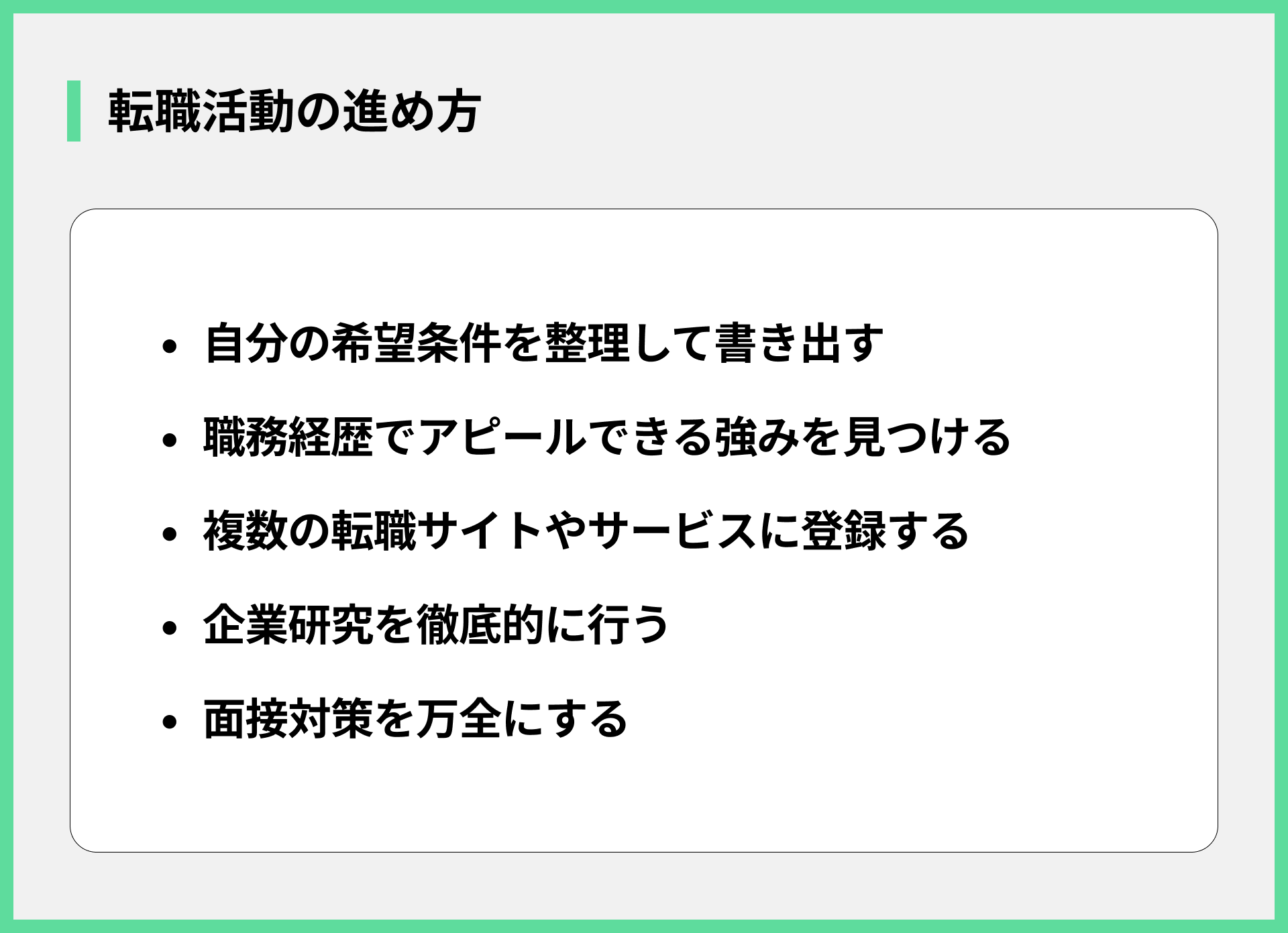 残業の少ない会社へ転職を成功させるためには、計画的に活動を進めることが大切です。以下の5つのステップで進めていきましょう。