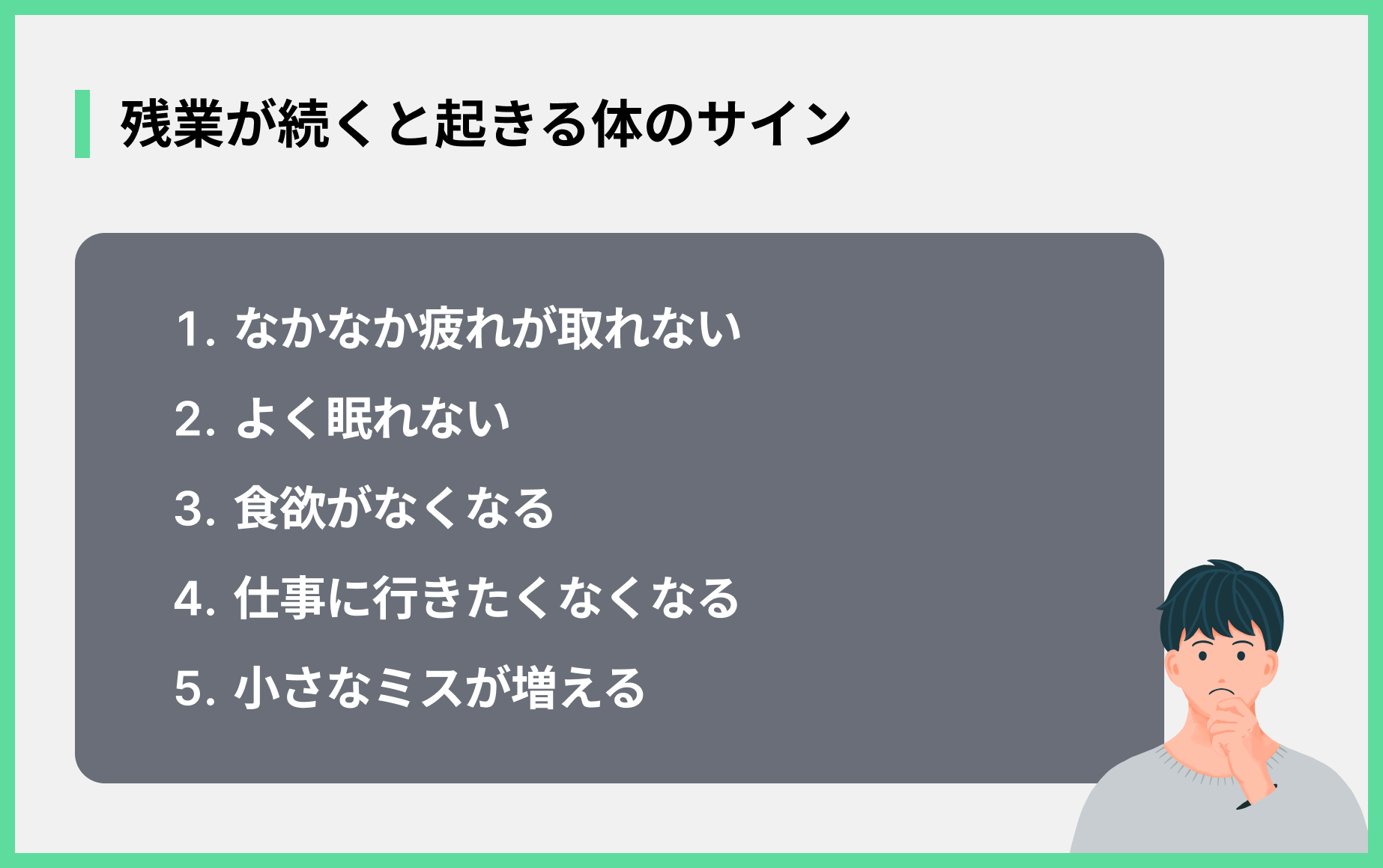 残業が多い環境で働き続けることには、いくつかのデメリットが伴います。具体的には以下の4つの点が挙げられます。