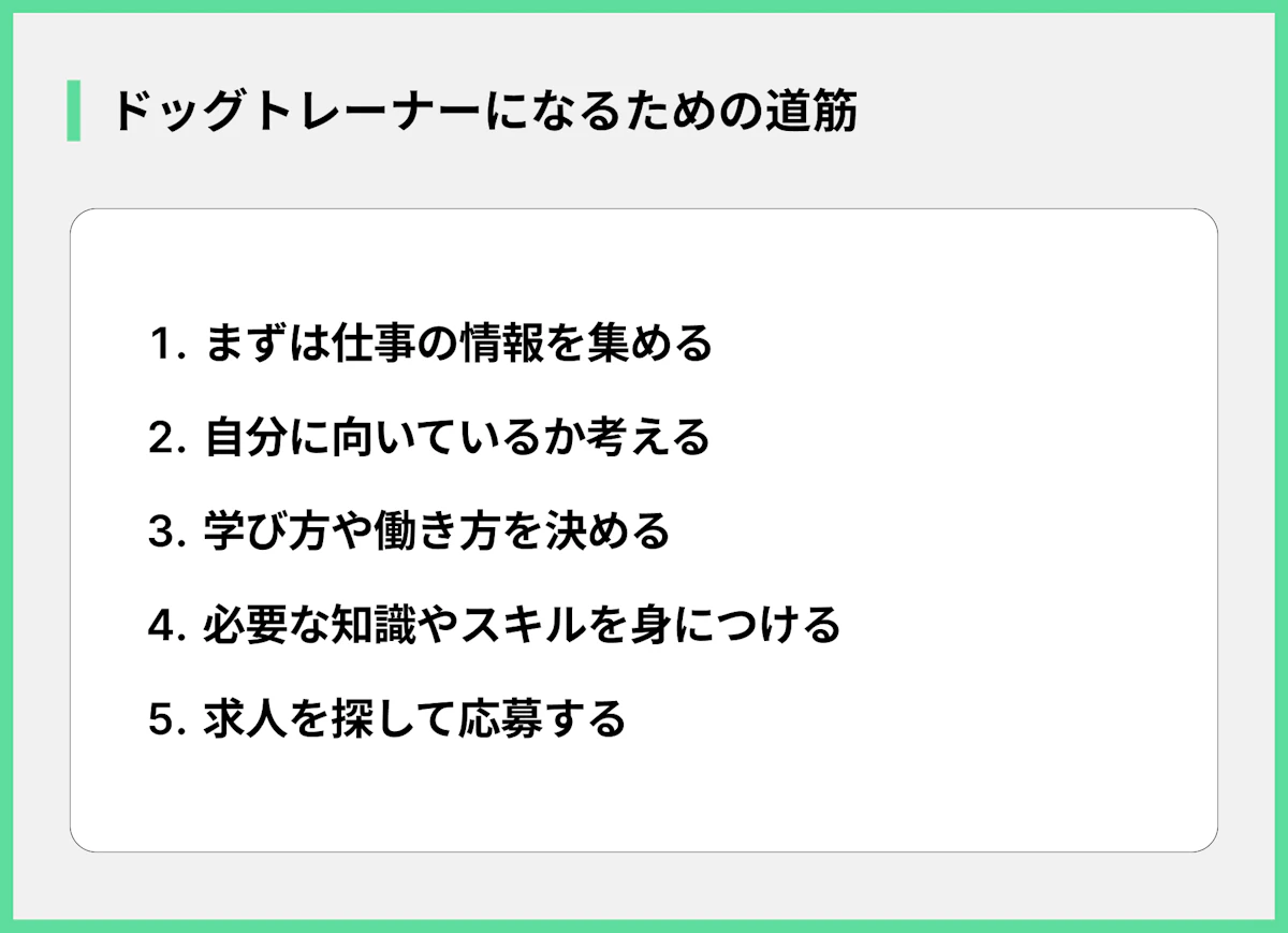 ドッグトレーナーになるために、特別な学歴は必要ありません。未経験から目指すための主な方法は以下の通りです。