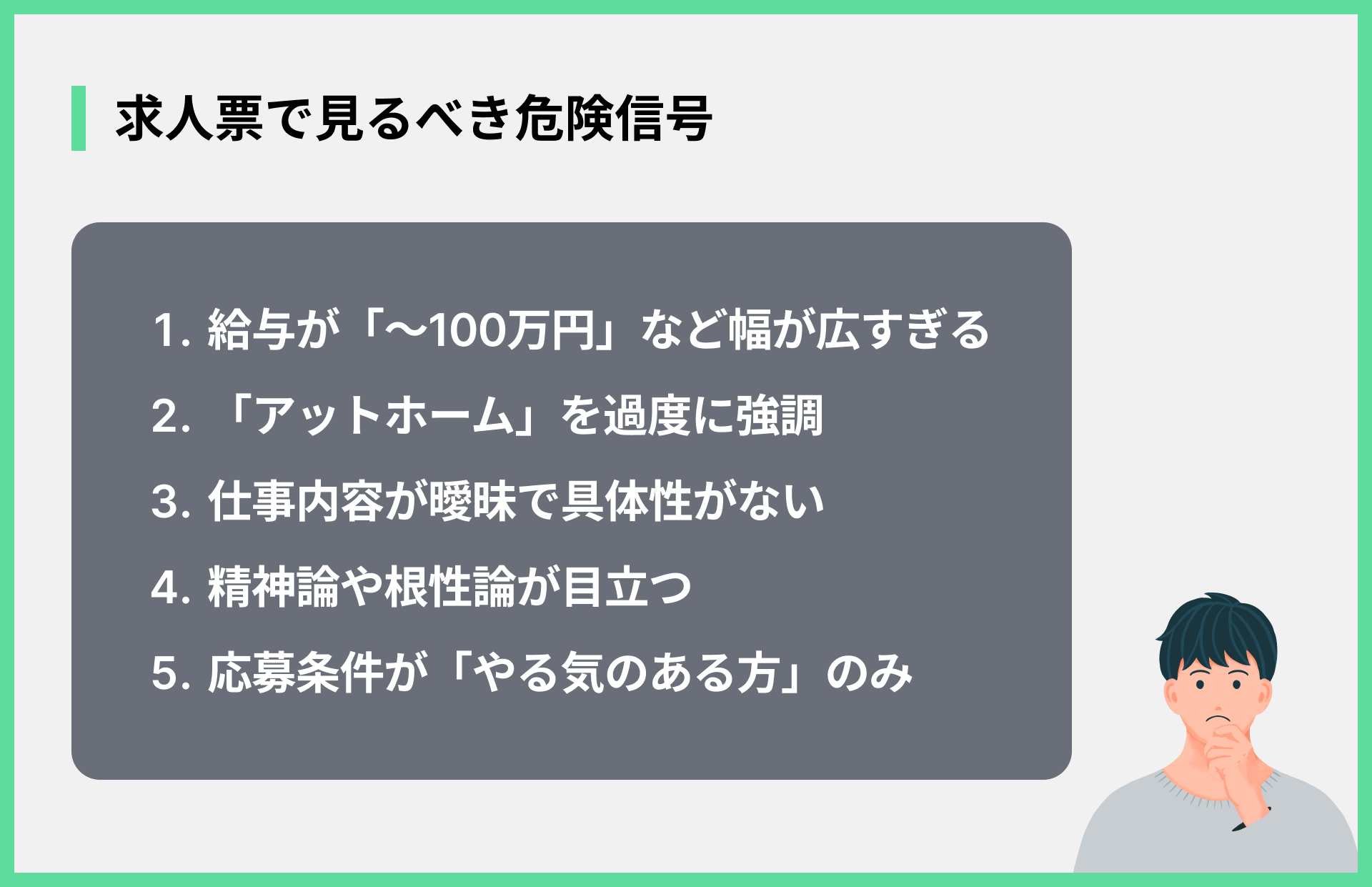 ホワイト企業を探すと同時に、働きがいを搾取するような「ブラック企業」を避けることも非常に重要です。求人情報や選考過程で見抜くためのポイントは以下の通りです。