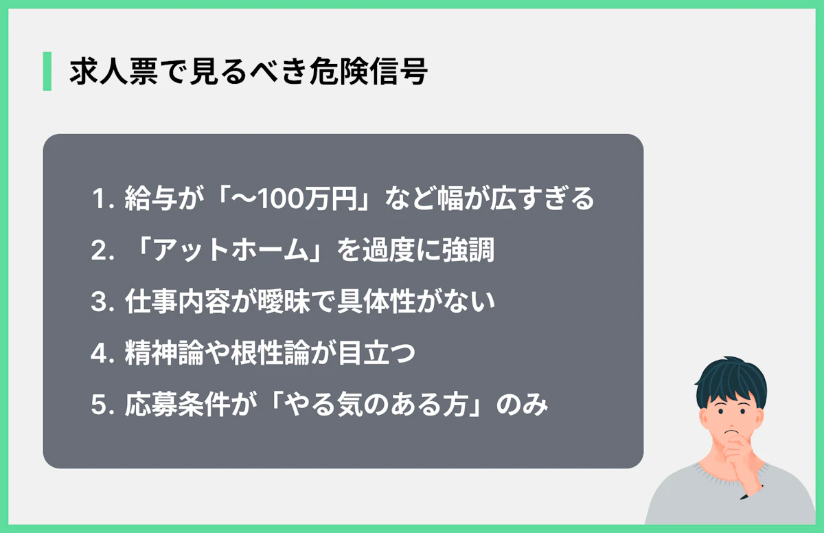 求人票に「誰でも月収100万円!」「感動をありがとう!」のように、具体性のない、やたらとキラキラした言葉が並んでいる場合は注意が必要です。本当に社員を大切にする企業は、給与体系や休日、具体的な仕事内容、研修制度などを明確に記載します。逆に、聞こえの良い言葉で具体的な待遇をごまかそうとしている企業は、労働環境に何らかの問題を抱えている可能性があります。「やりがい」や「成長」はもちろん大切ですが、それらをアピールする前に、働く上での基本的な条件がきちんと示されているかを確認しましょう。