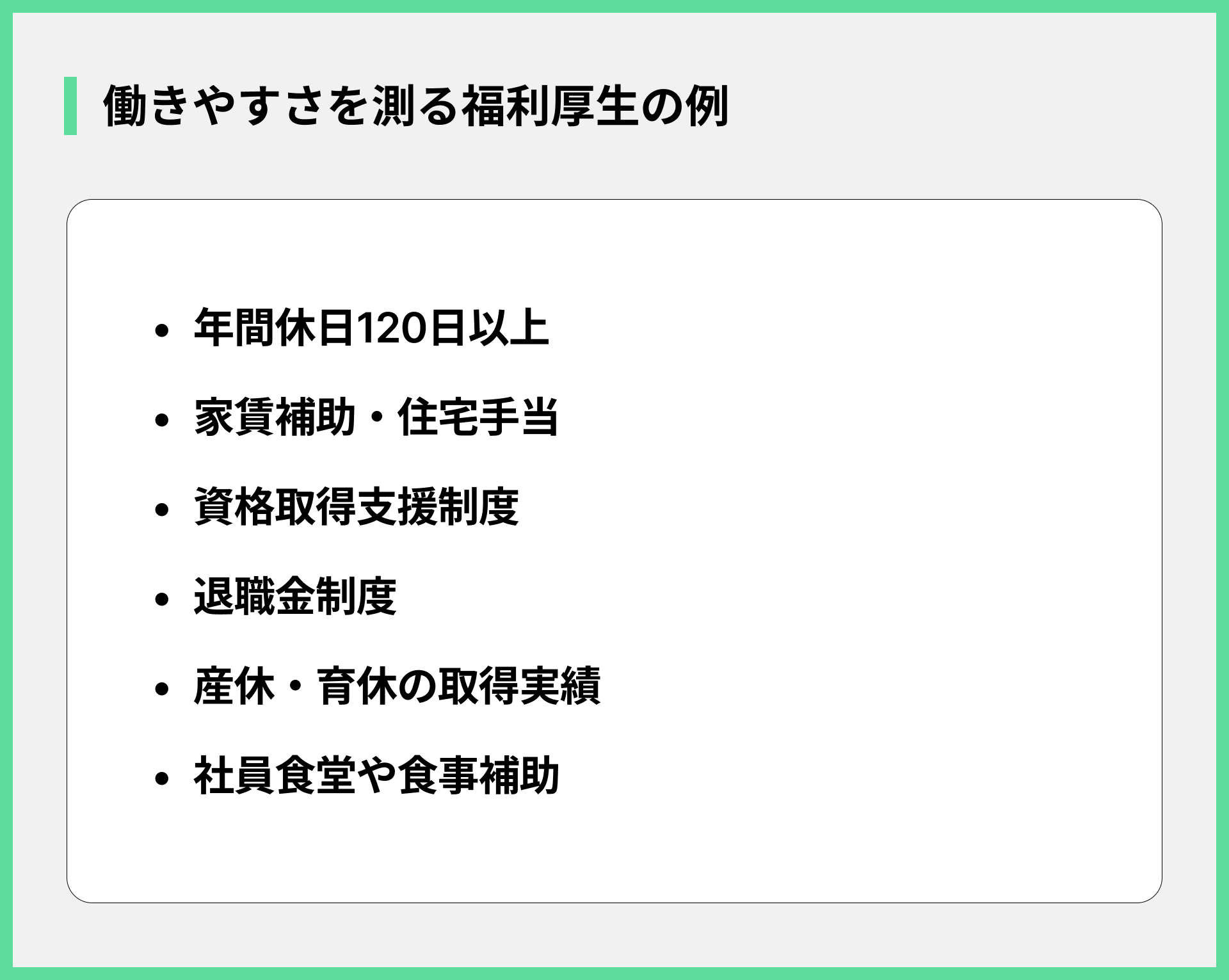 多くの人が「ホワイト企業に入りたい」と考えますが、その定義は人それぞれです。自分にとっての「ホワイト企業」とは何かを明確にするための具体的な項目は以下の通りです。