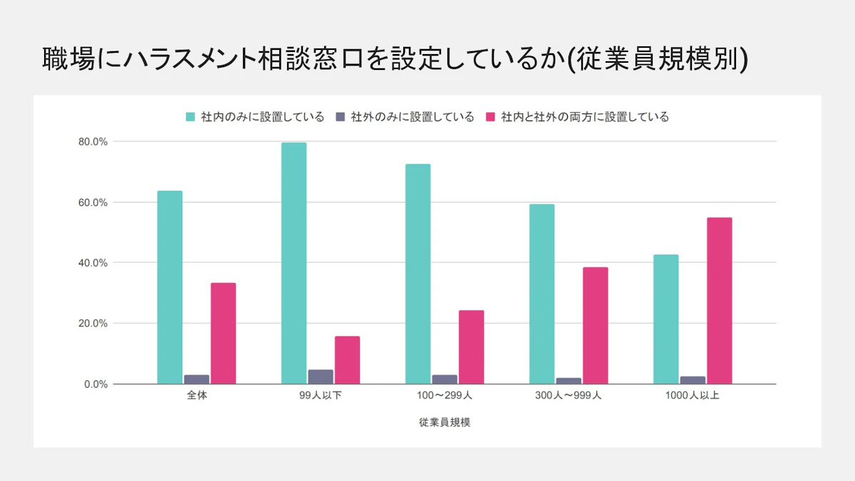 以下のグラフを見てもわかるように、企業規模が大きくなるほど、社外にもハラスメント相談窓口を設定しているため、相談しやすい環境になっています。そのため、企業のホームページや求人情報に記載されているセクハラ対策の内容をよく確認する必要があります。
