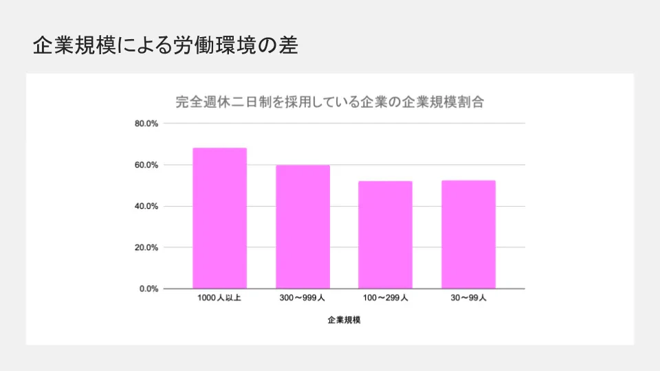 以下の2つの資料より、賞与額が増加する企業の割合は、中小企業よりも大企業のほうが多いです。また休日日数においても、大企業の方が多くなっており、安定して働くのであれば、大企業で働いた方が良いと言えるでしょう。