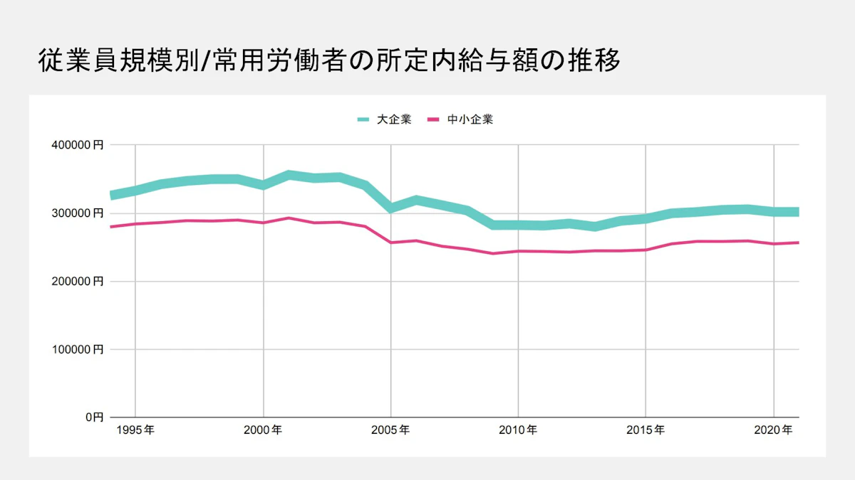 ただし、このデータは平均値なので、年齢によるキャリアアップや業界、職種による賃金差を加味すると、多少データは変わってきます。しかし、平均的に中小企業の給与の方が低いのは確かだと言えます。