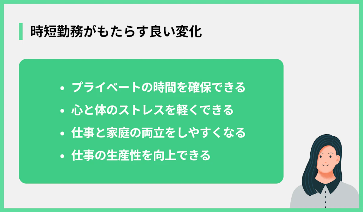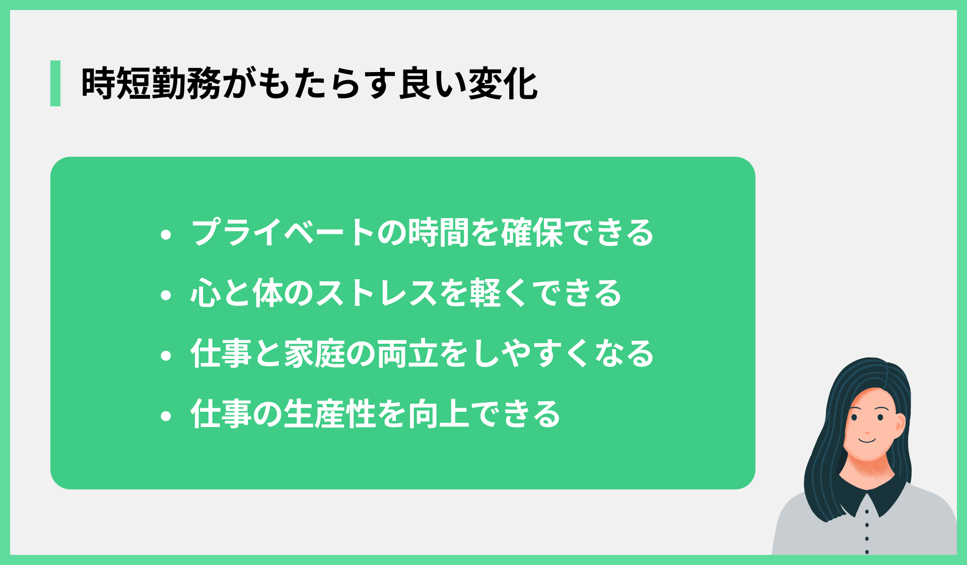 時短勤務をして「よかった」と感じる理由を見てきましたが、改めてメリットを整理してみましょう。具体的なメリットは、以下の通りです。
