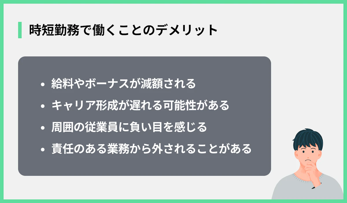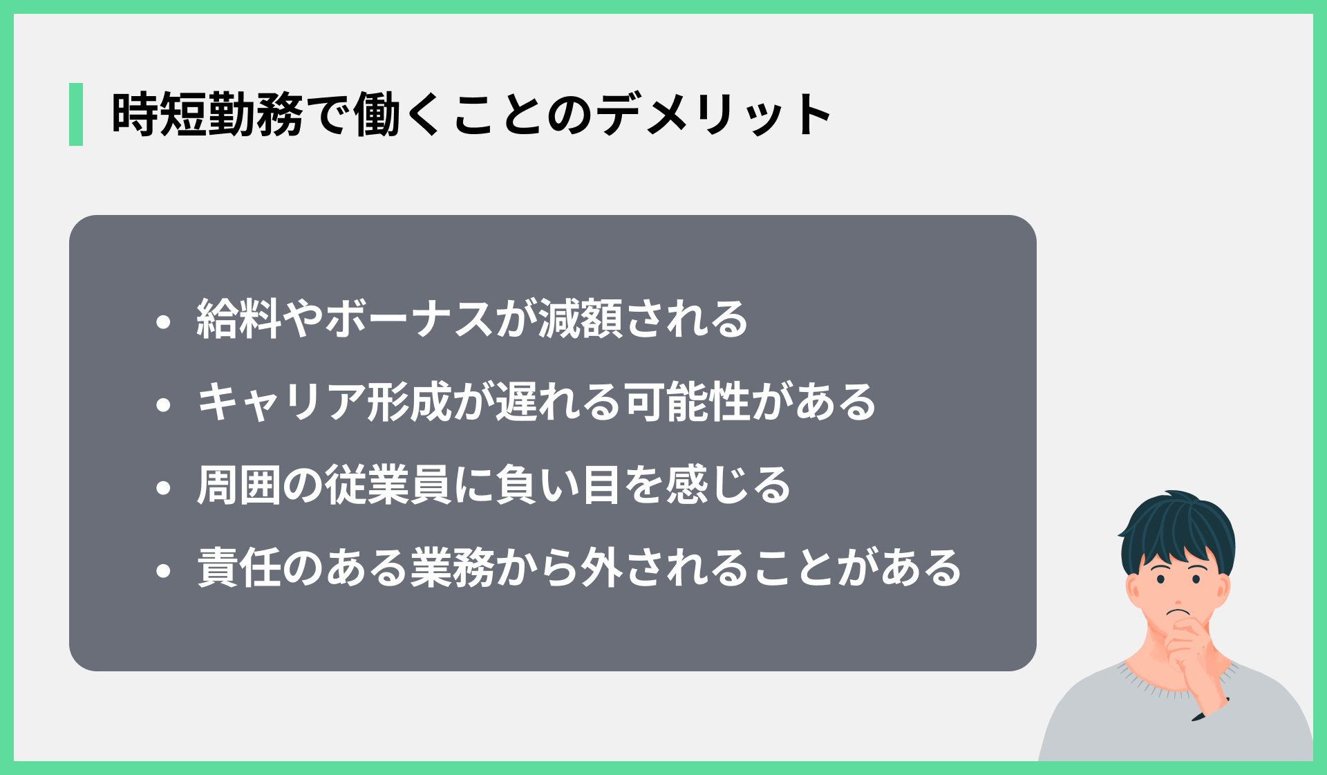 多くのメリットがある一方、時短勤務にはもちろんデメリットもあります。後悔しないためには、事前にしっかりと把握しておくことが重要です。具体的なデメリットは、以下の通りです。