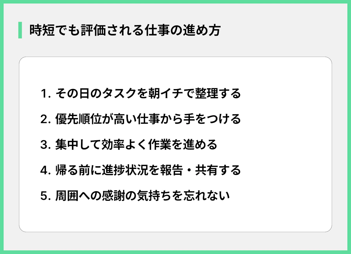 キャリアや評価への不安は、仕事のやり方を変えることで解消できます。限られた時間で成果を出す工夫をすることが、信頼につながります。例えば、一日の最初にタスクの優先順位を決めたり、集中して作業に取り組んだりするなど、生産性を高める意識が大切です。短い時間でも質の高い仕事ができれば、周囲からの評価も自然と高まります。