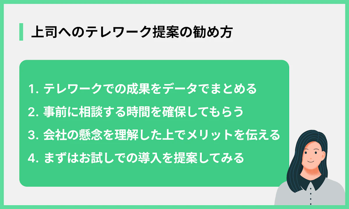 - 週1日など部分的なテレワークを提案する