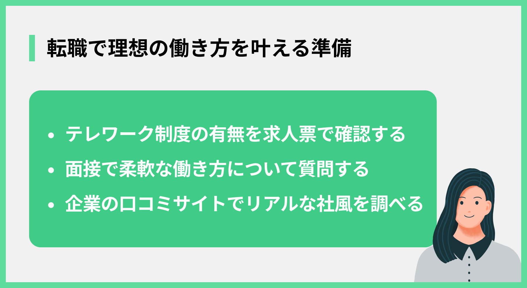 色々と試してみたけれど、やはり今の会社では働き方を変えるのが難しいと感じるかもしれません。その場合は、自分の希望を叶えられる会社へ転職することも、前向きな選択肢の一つです。転職活動を始める前に、いくつか準備しておきましょう。