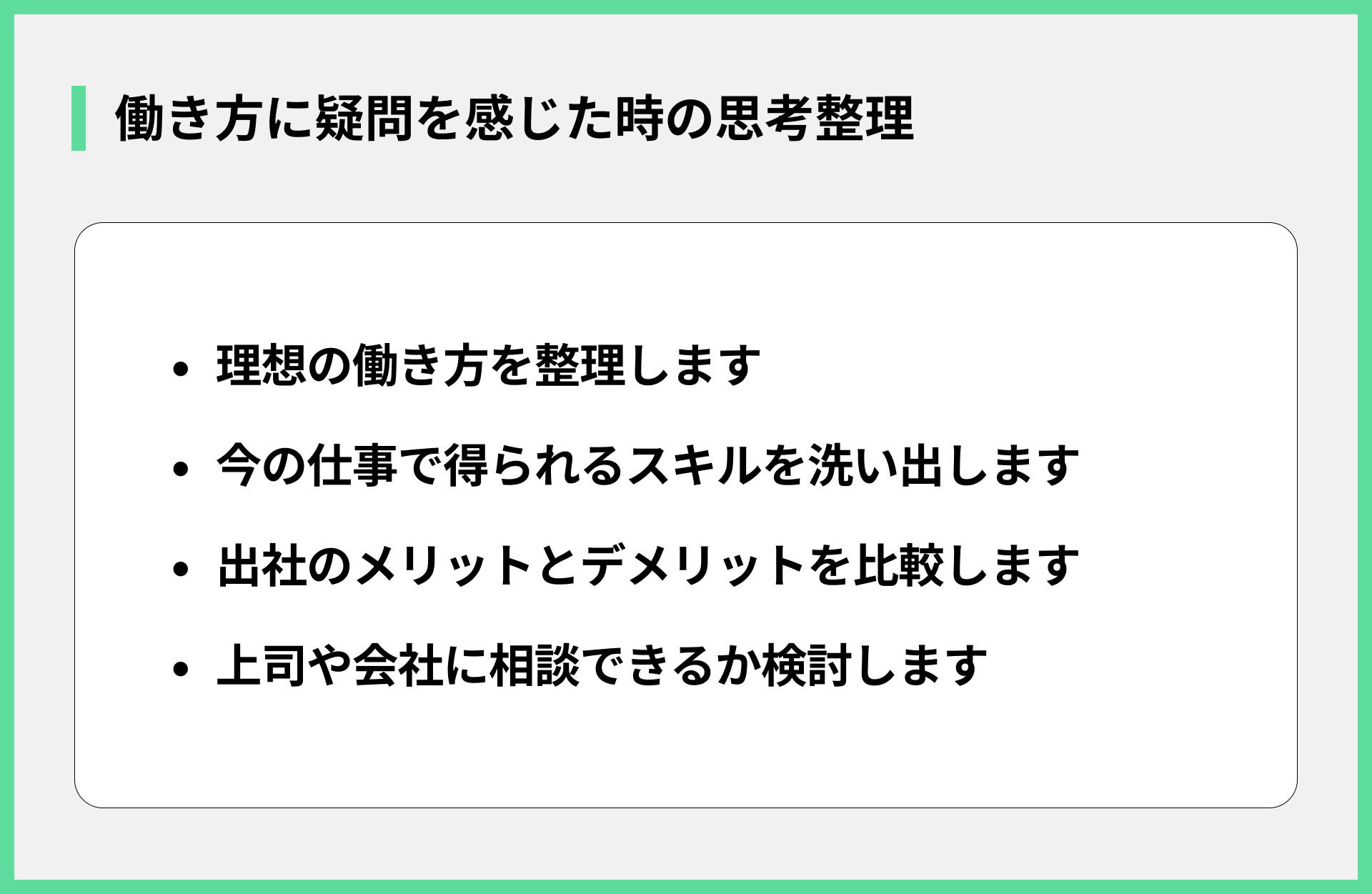 次に、今の職場で得られることや、身についたスキルを客観的に見つめ直してみましょう。働き方に不満があったとしても、仕事内容自体にはやりがいを感じていたり、将来役立つスキルが身についていたりする可能性もあります。「この経験は、次のステップでも活かせそうだな」「このスキルは、もっと伸ばしたいな」といったことが見えてくれば、今の会社に留まるべきか、転職すべきかの判断材料になります。感情だけで判断せず、冷静に現状を分析することが重要です。