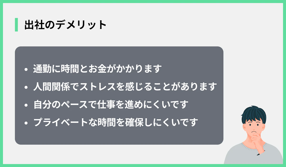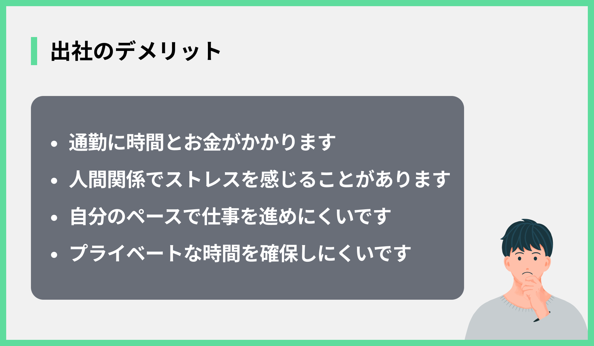 一方で、毎日会社に通うことには、大変な面もあります。出社する働き方のデメリットをあらかじめ知っておくことで、対策を考えやすくなります。考えられるデメリットは、以下の通りです。