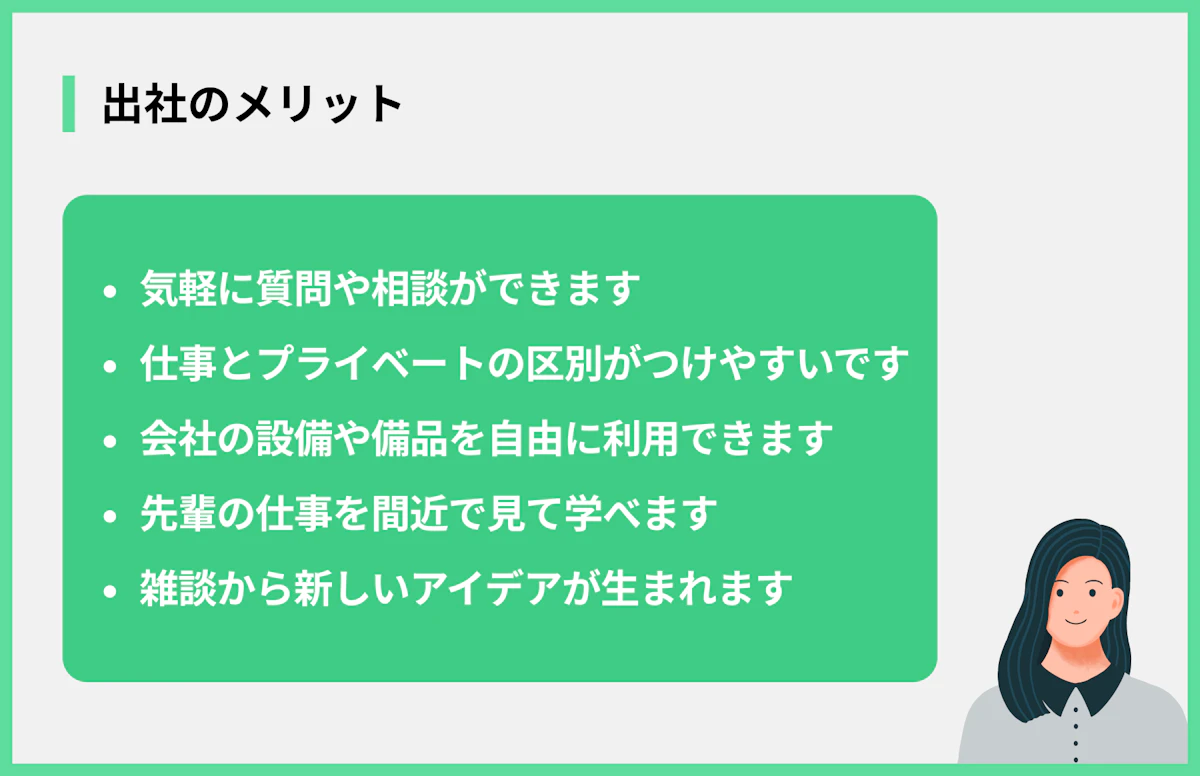 家で仕事をしていると、ついダラダラしてしまったり、逆に仕事がいつまでも終わらなかったりして、オンとオフの切り替えが難しいことがあります。その点、出社は仕事モードへの切り替えがしやすいのが魅力です。「家を出て、会社に着いたら仕事開始。会社を出て、家に帰ったらリラックスタイム」というように、場所を移動することで気持ちのスイッチが自然と切り替わります。生活にメリハリが生まれるので、だらだらしがちな人や、仕事とプライベートをきっちり分けたい人にとっては、心地よい働き方と感じられるでしょう。