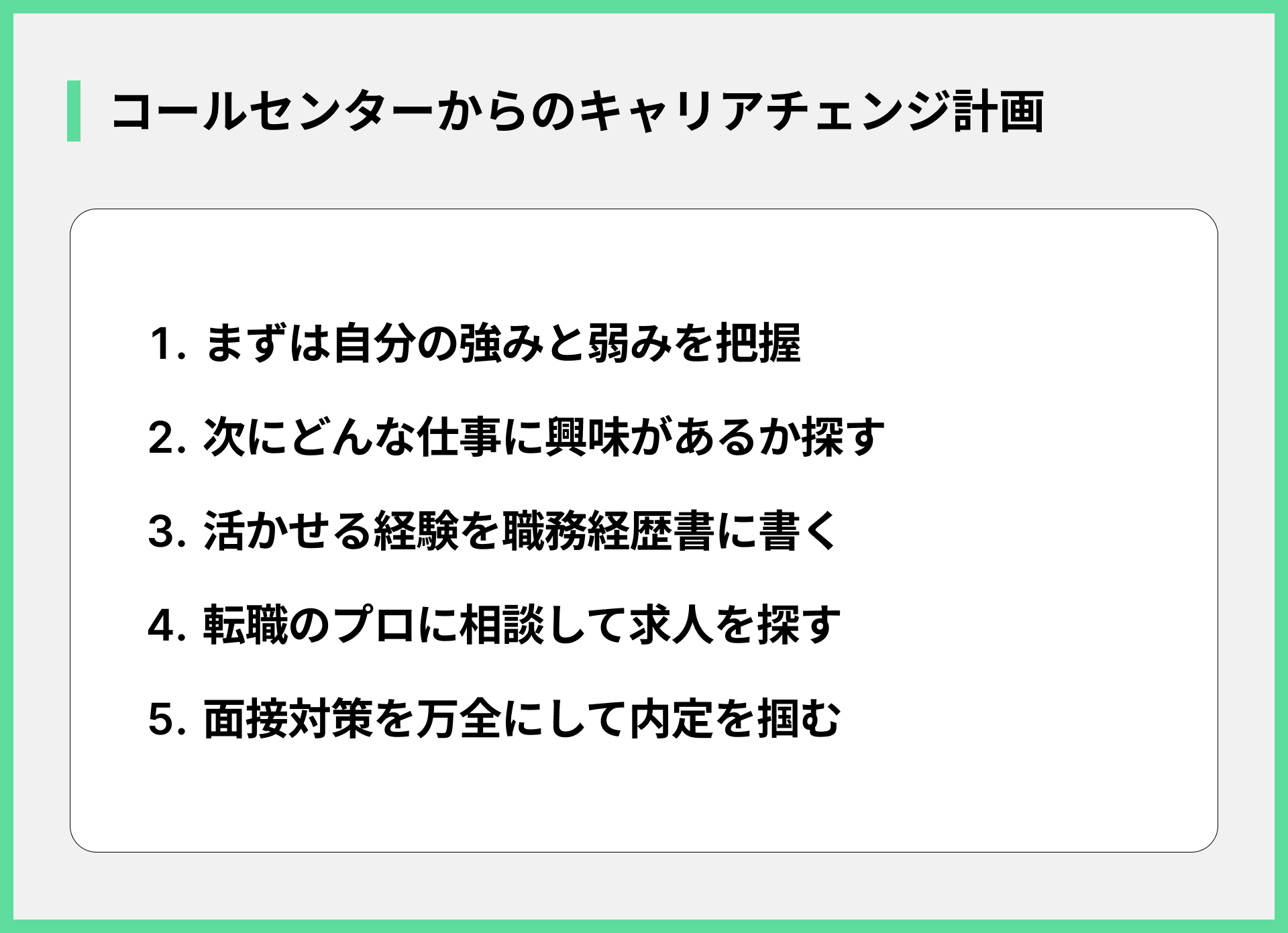 次のキャリアへ一歩を踏み出すと決めたなら、後悔しないためにしっかりと準備を進めることが大切です。以下のステップで、自分の未来を切り拓いていきましょう。