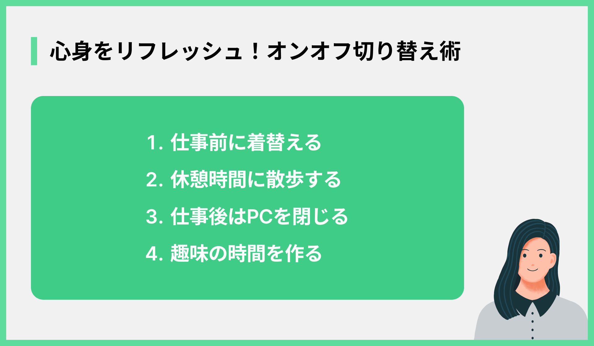 - 仕事のオンとオフをはっきりさせる