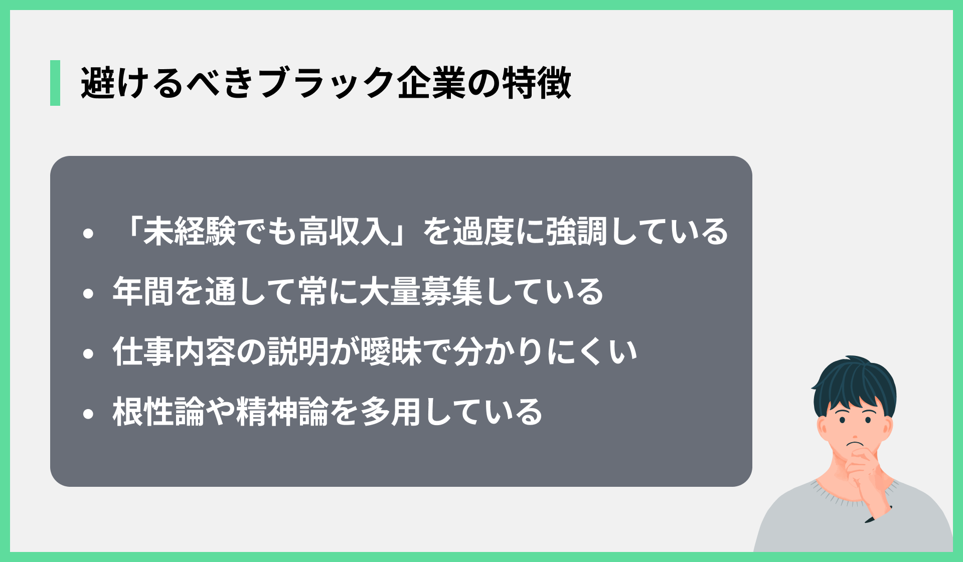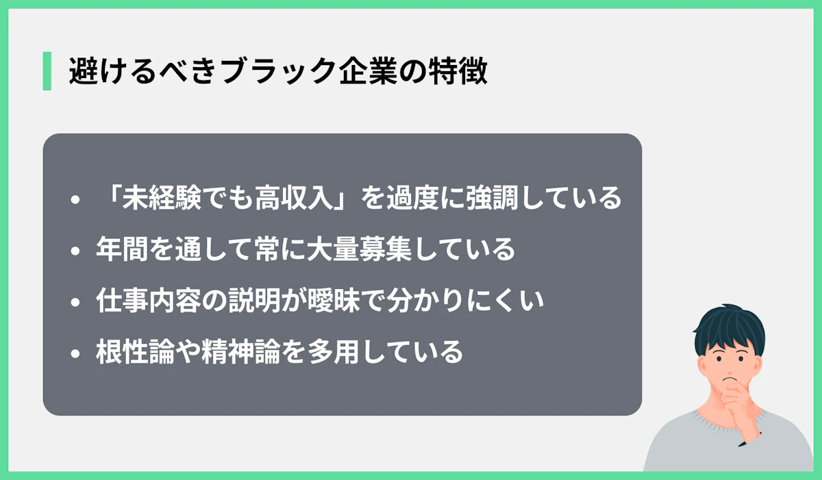 ホワイト企業を見つけるのと同じくらい、ブラックな企業を避けることも重要です。一見魅力的に見える求人にも、注意すべきサインが隠れていることがあります。ここでは、特に気をつけるべき求人の特徴を解説します。具体的には以下の通りです。