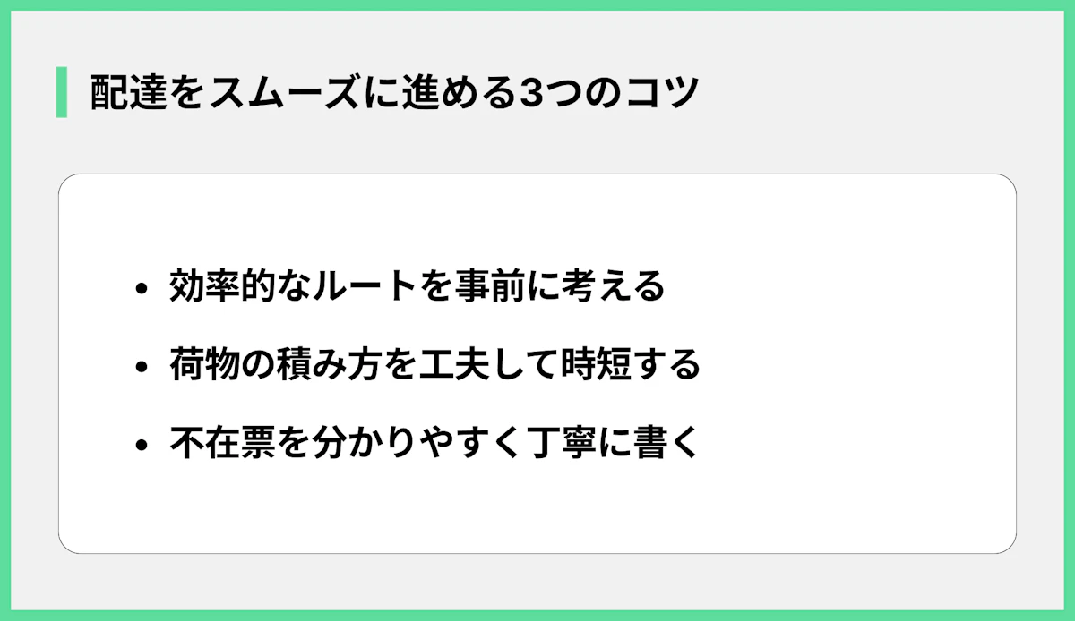 宅配ドライバーの仕事に興味はあるけれど、具体的に何をするのかよくわからない、という人も多いかもしれません。ここでは宅配ドライバーの主な仕事内容を4つの項目に分けて解説します。