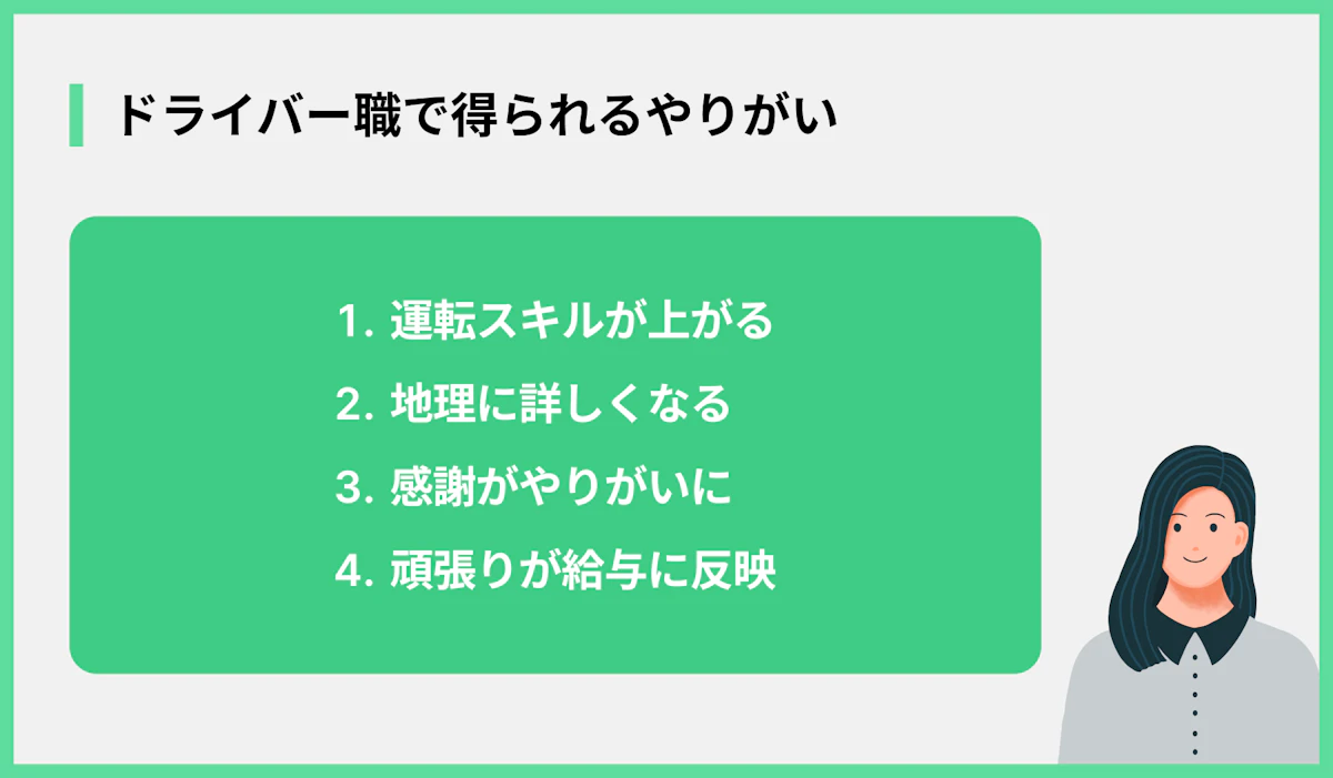 きついイメージがあるかもしれませんが、宅配ドライバーにはたくさんの魅力やメリットがあります。ここでは、働く上で感じられる主なメリットを紹介します。