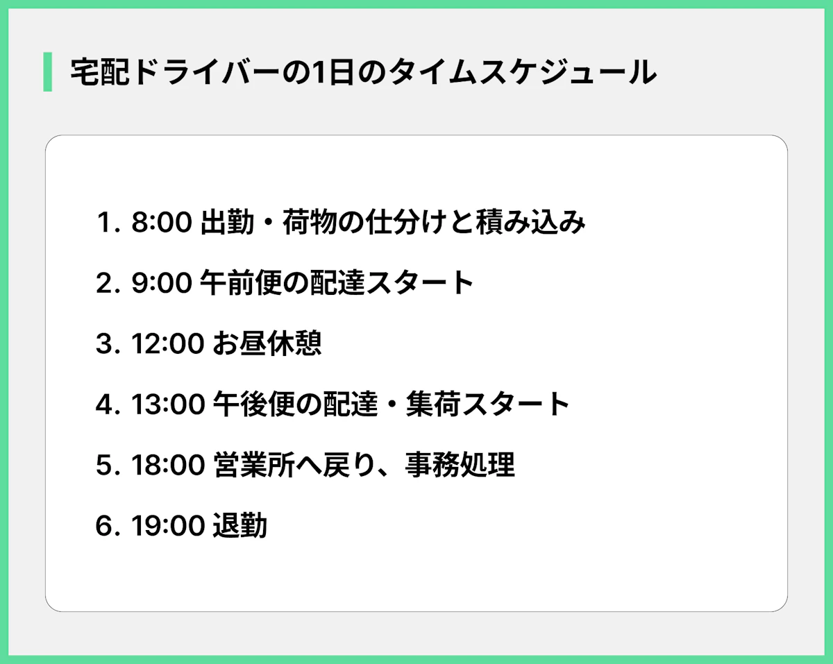 宅配ドライバーがどんな一日を過ごしているのか、具体的なタイムスケジュールを見てみましょう。会社によって多少の違いはありますが、ここでは一般的な流れを紹介します。